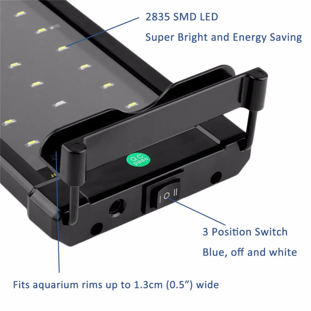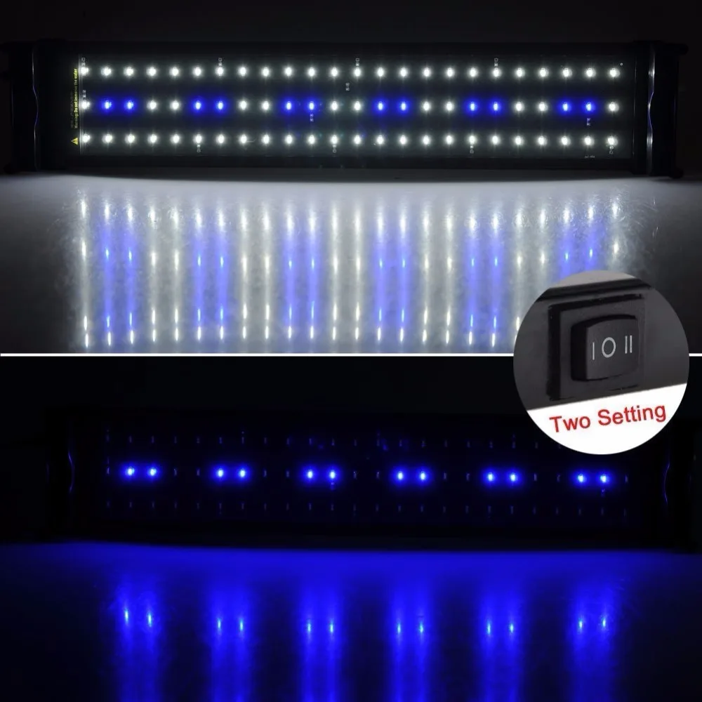 Почему освещение важно для аквариумовВ своей самой основной роли аквариумное освещение позволяет любителям наблюдать за обитателями аквариума. Но что еще более важно, правильное освещение аквариума обеспечивает жизненную энергию для фотосинтетических растений и рыб. Правильное освещение аквариума важно для любой системы, которая содержит фотосинтетические организмы, такие как растения, анемоны или кораллы. Освещение также влияет на поведение рыб и физиологию и является жизненно важным для общего здоровья и самочувствия всего аквариума. Регулируемые крепежные ножкиРегулируемые крепежные ножки обеспечивают гибкость в установке аквариума шириной 28-50 см (11-19 дюймов). Светодиодный светильник синего и белого цветаСветодиодный светильник ing требует гораздо меньше энергии, чтобы произвести Блестящий светильник для энергоэффективного. 36 светодиодов (30 белых и 6 синих) состоят из белых и синих настроек.