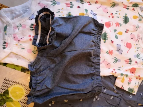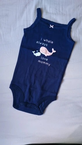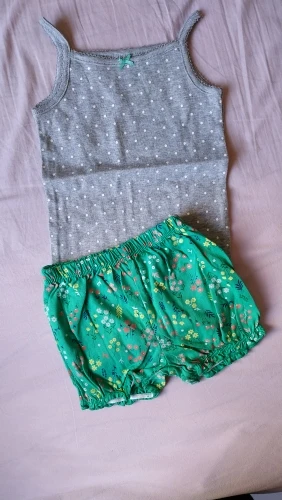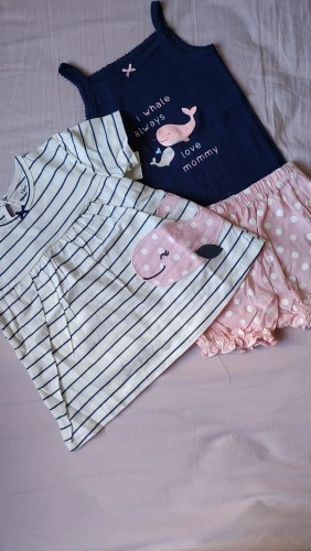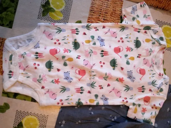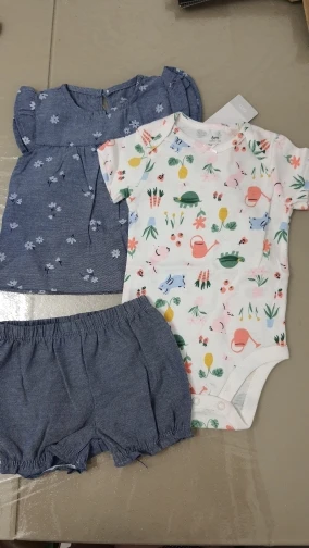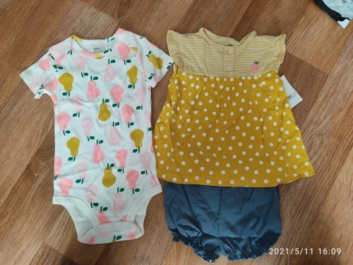 Не очень понравился. Лучше всего бодик: и по качеству (плотный хлопок) и по соответствию картинке. Кофточка темнее, чем на картинке. На ощупь скорее синтетическая, чем хлопковая. Шорты плохого качества: синтетика, ткань неравномерно окрашена, торчат нитки. Очень разочаровали. На ребёнка ростом около 71 см с запасом на лето. Думаю, до роста 74 см хорошо будет. Бодик чуть длиннее и чуть шире оригинального Картерс 12м. Продавец отправил в день покупки. Быстрая доставка.