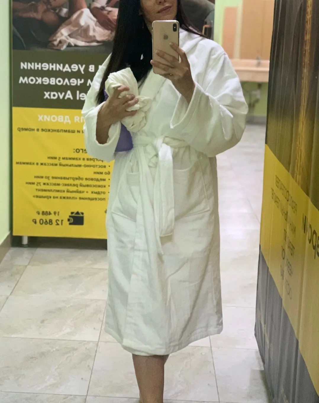 Толстый, теплый, хорошу впитывает воду, очень мягкий и удобный, длинный. доставка - 8 дней, очень быстро. продавец ответственный, сделал работу как требует покупатель, я очень рекомендую товар. мой вес 71 кг, рост 178 см, размер XL очень подходит, отличный халат, я счастлива! материал: хлопок, по ощущениям мягкий и легкий, удобно надевать и снимать, когда дома. заказанный цвет - белый, выглядит благородно.
