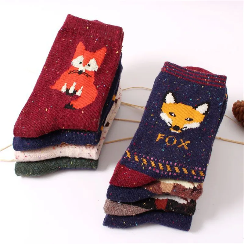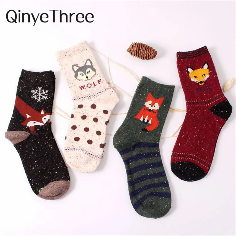 Толстые шерстяные Хлопковые женские носки в Корейском стиле для девушек осень-зима в стиле Харадзюку брендовые милые рождественские носки в полоску с изображением животных лисы волка