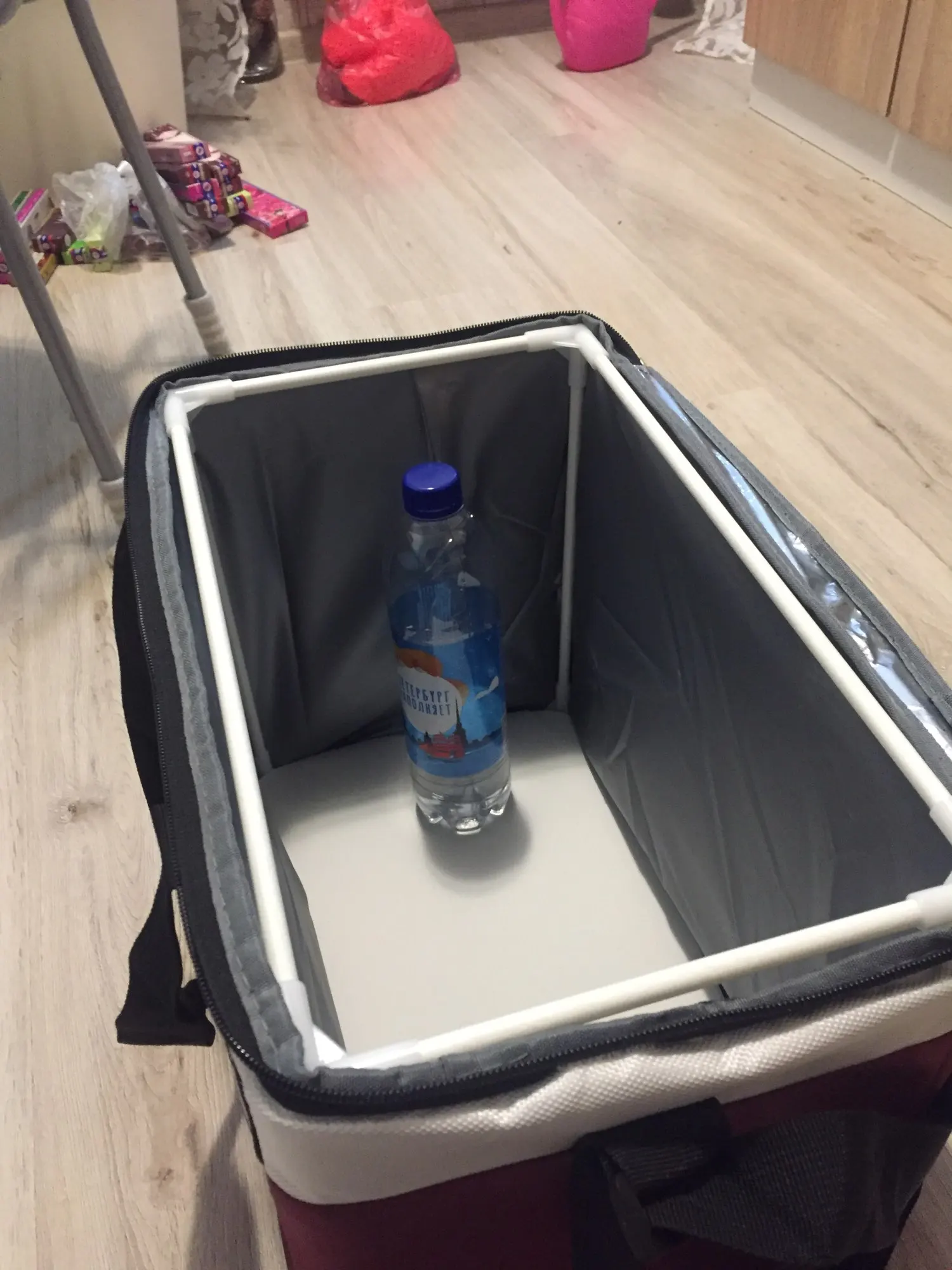 Сумка Большая, классная. Взяла с каркасом и не прогадала. С ним лучше держит форму, хотя и без него тоже норм. Каркас пластиковый , поэтому легкий. Дно из толстого картона. Немного кривое, но это ерунда. В комплекте пять пачек с охлаждающим компонентом