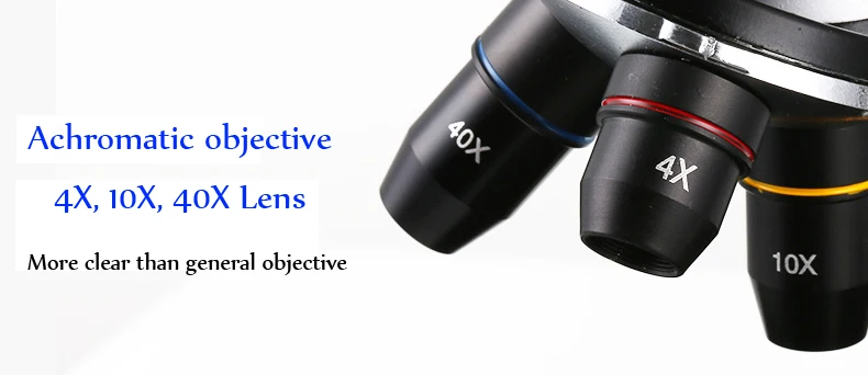 2. Ахроматическая объективная линза: 3 линзы в металлических бочках, изготовленные из высококачественного оптического стекла с мощностью 4x, 10x и 40x; Вращение на 360 градусов и наклонение на 45 градусов для удобного наблюдения с удобной осанкой головы.
