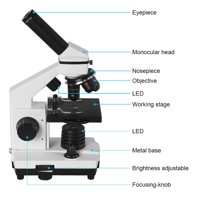 Это идеальный микроскоп для студентов, чтобы узнать науку. Он поставляется с полными оптическими стеклянными элементами, металлической рамкой, поворотной монокулярной головкой на 360 градусов, с системой освещения вверх и вниз светодиодный, которая использует либо розетку (адаптер включен) или три батарейки типа АА (не входят в комплект). Это идеальный микроскоп для учёных в домашней школе и от учеников начальной до средней школы. Микроскоп этого калибра является отличным инструментом для любителей. Он поставляется совершенно новый в заводской герметичной коробке.
