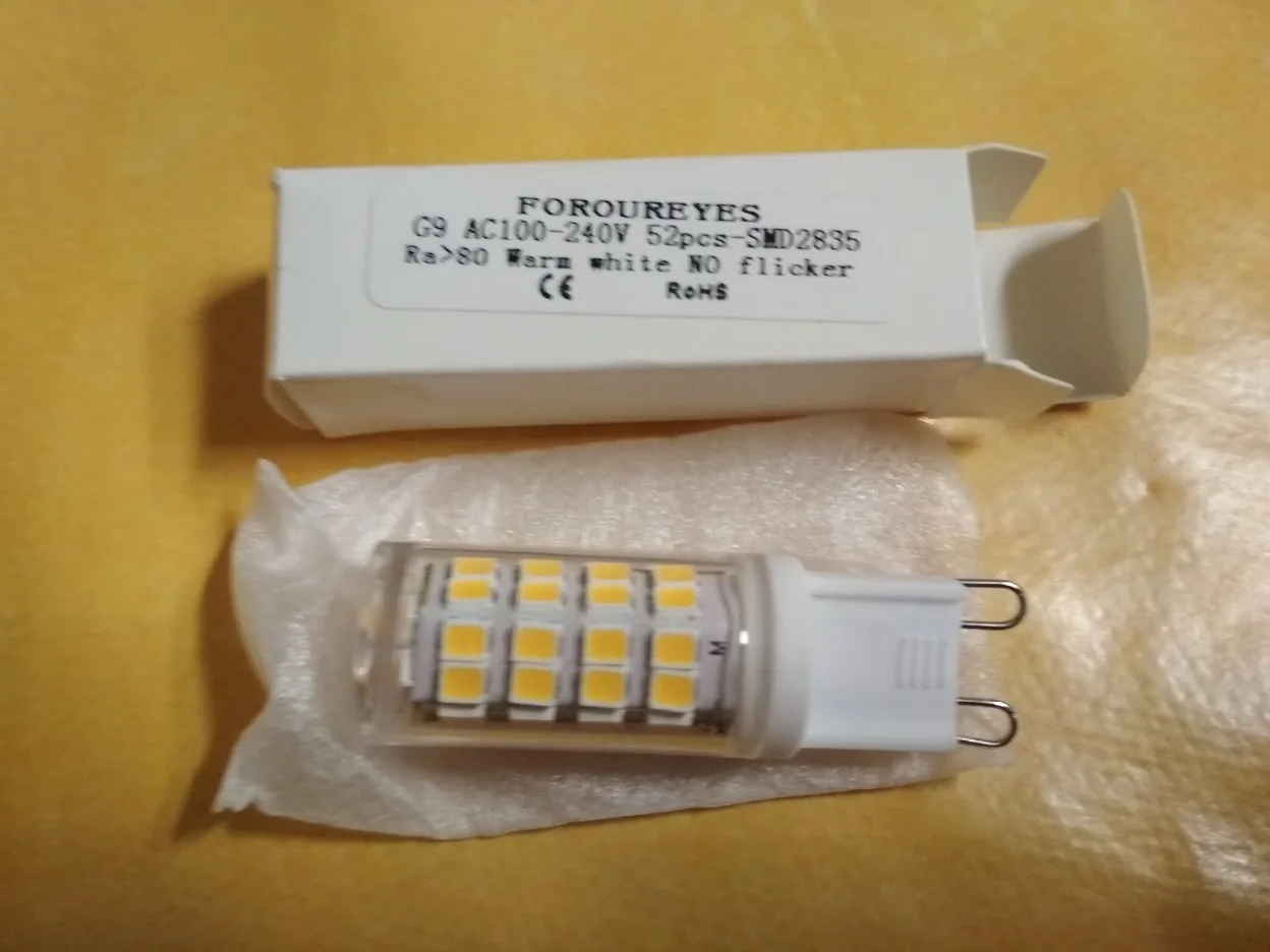 Прибыл в течение 11 дней до NL, на один день больше, чем промазывает, но все еще довольно быстро. Это мой второй заказ, потому что качество сборки очень хорошее. Светодиодная лампа G9 обеспечивает приятный теплый белый свет, очень яркий и нет мерцания. Намного лучше, чем светодиодные лампы G9, которые я купил у других продавцов несколько лет назад. Единственным недостатком является то, что эта лампа (как и мой первый заказ) потребляет только 2,7 Вт, что не соответствует описанию (5 Вт). По этой причине я не могу дать 5 звезд, только 4.
