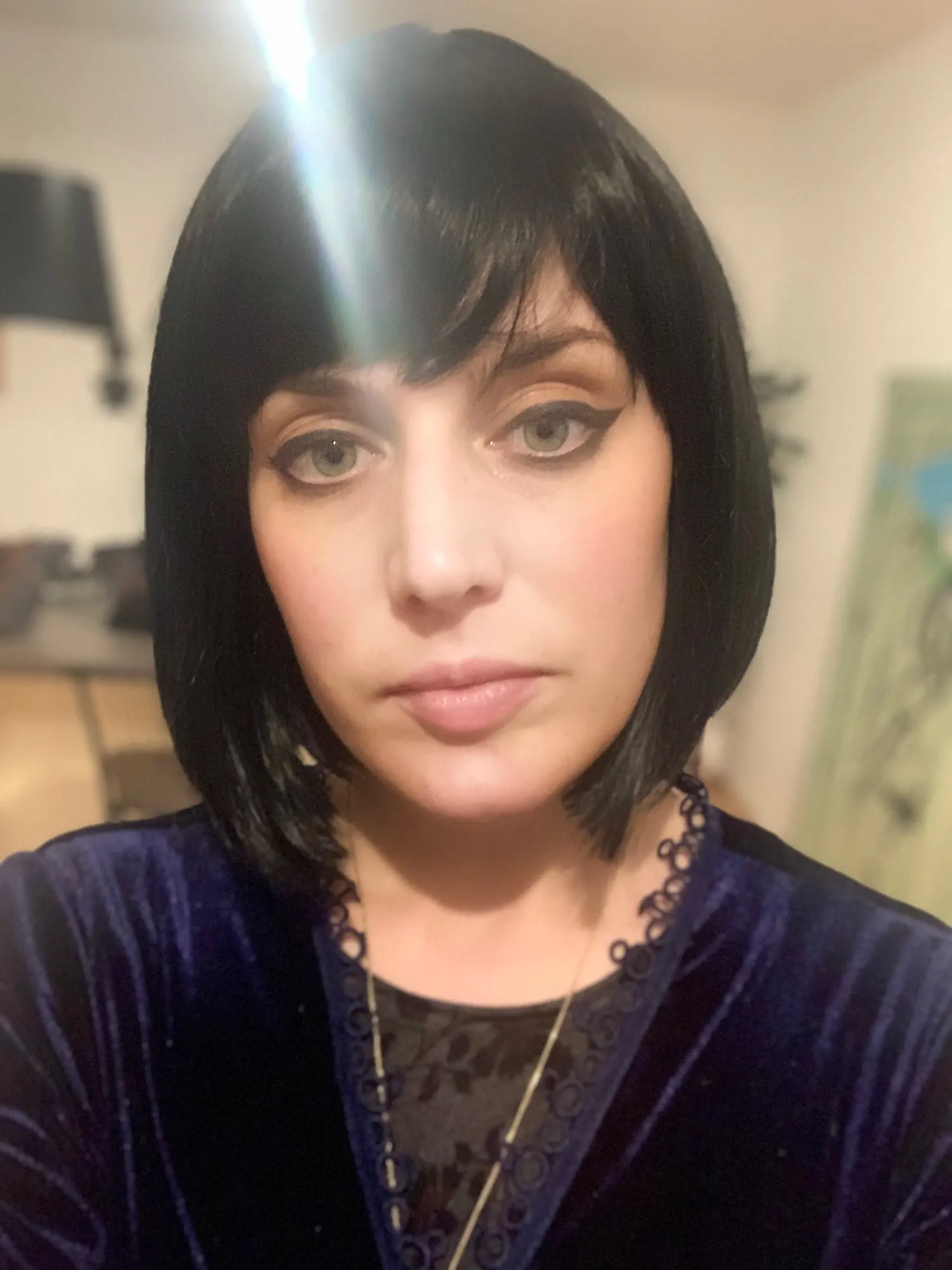 Парик выглядит нормально. К сожалению, он не имеет зажимов/расчесок, чтобы прикрепить его к вашей голове/волосам, поэтому он не является безопасным и сползает по мере того, как вы его носите.