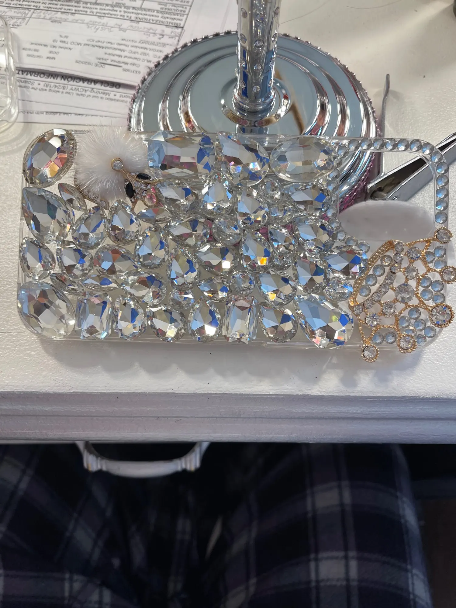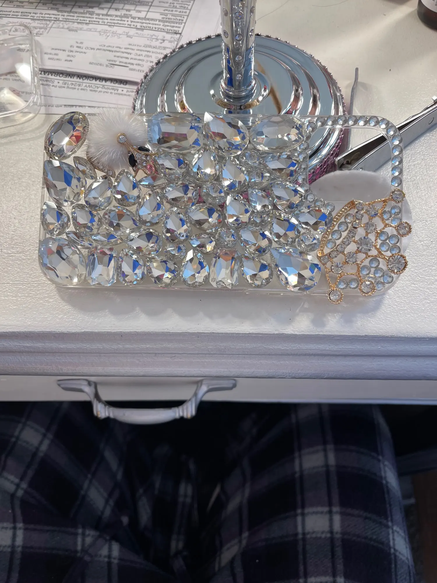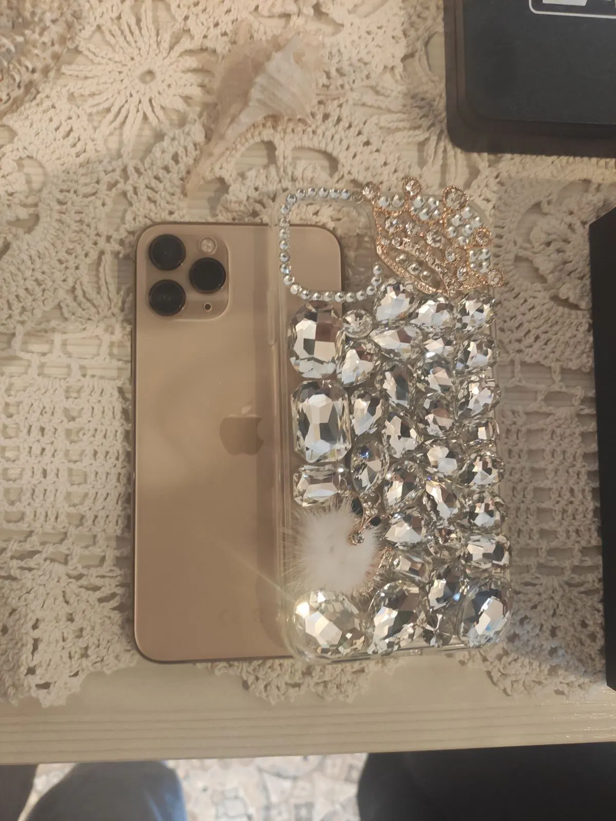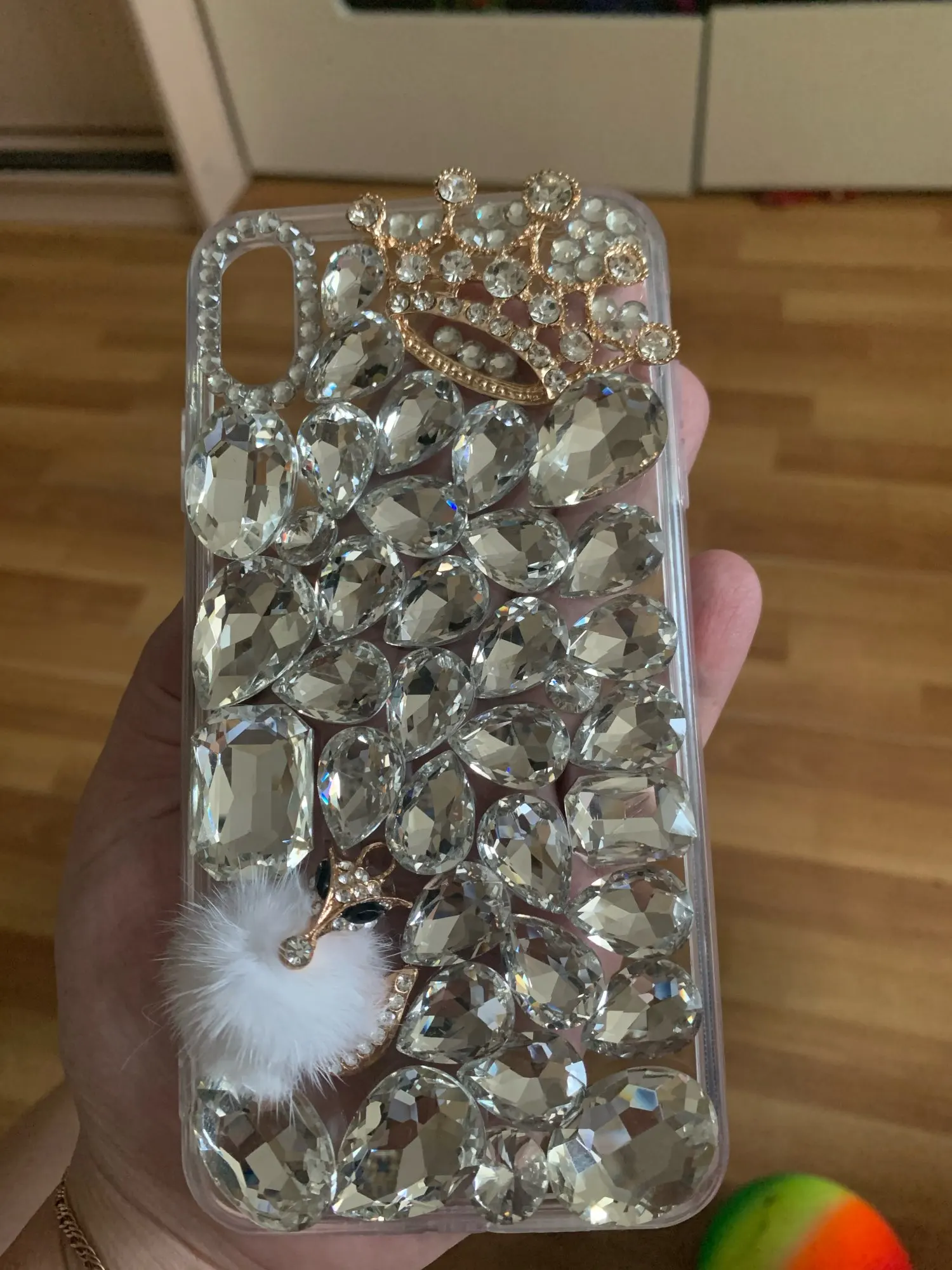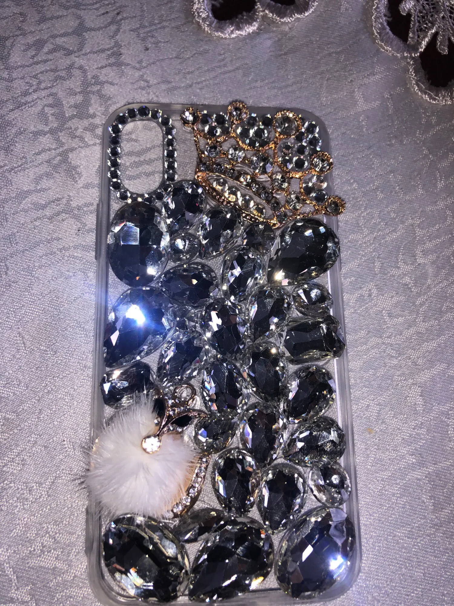 Точно как описано. Вид как на фото. Очень доволен! Драгоценности, похоже, хорошо приклеены. Он немного тяжелый, как и ожидалось, из очень большого количества драгоценностей. Но определенно стоит того!