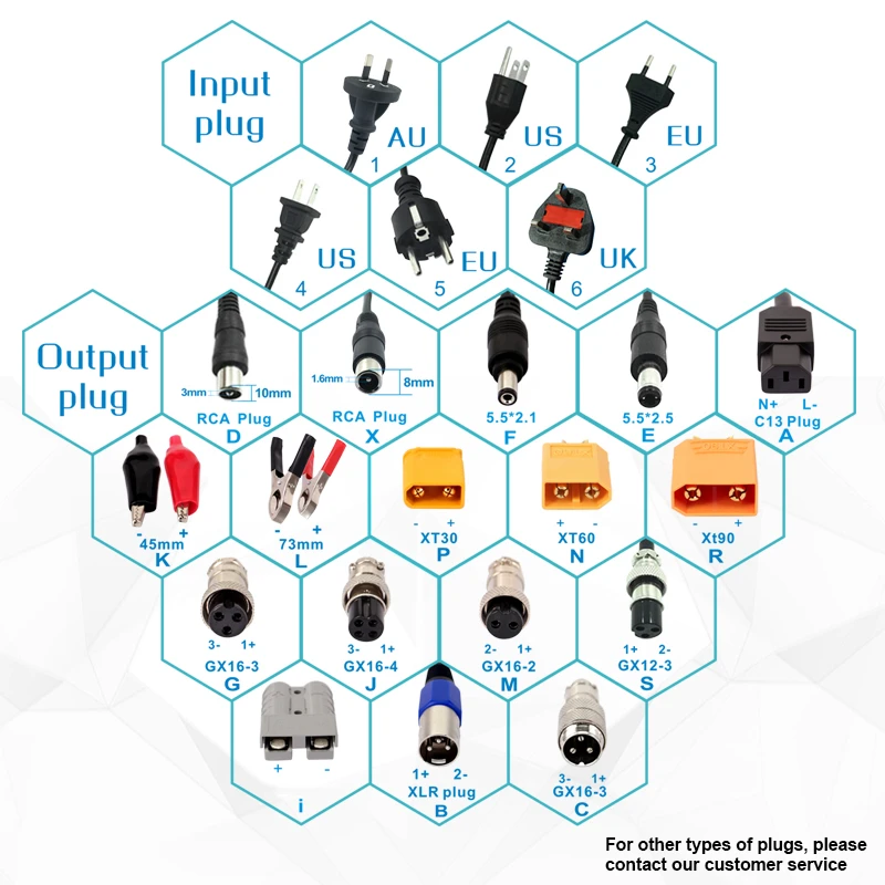 Пожалуйста, оставьте четкие слова о входных вилках переменного тока и выходных вилках постоянного тока, таких как «AC: номер 3, DC:G«Особенно» и «f», в противном случае ваш заказ не может быть отправлен, спасибо!