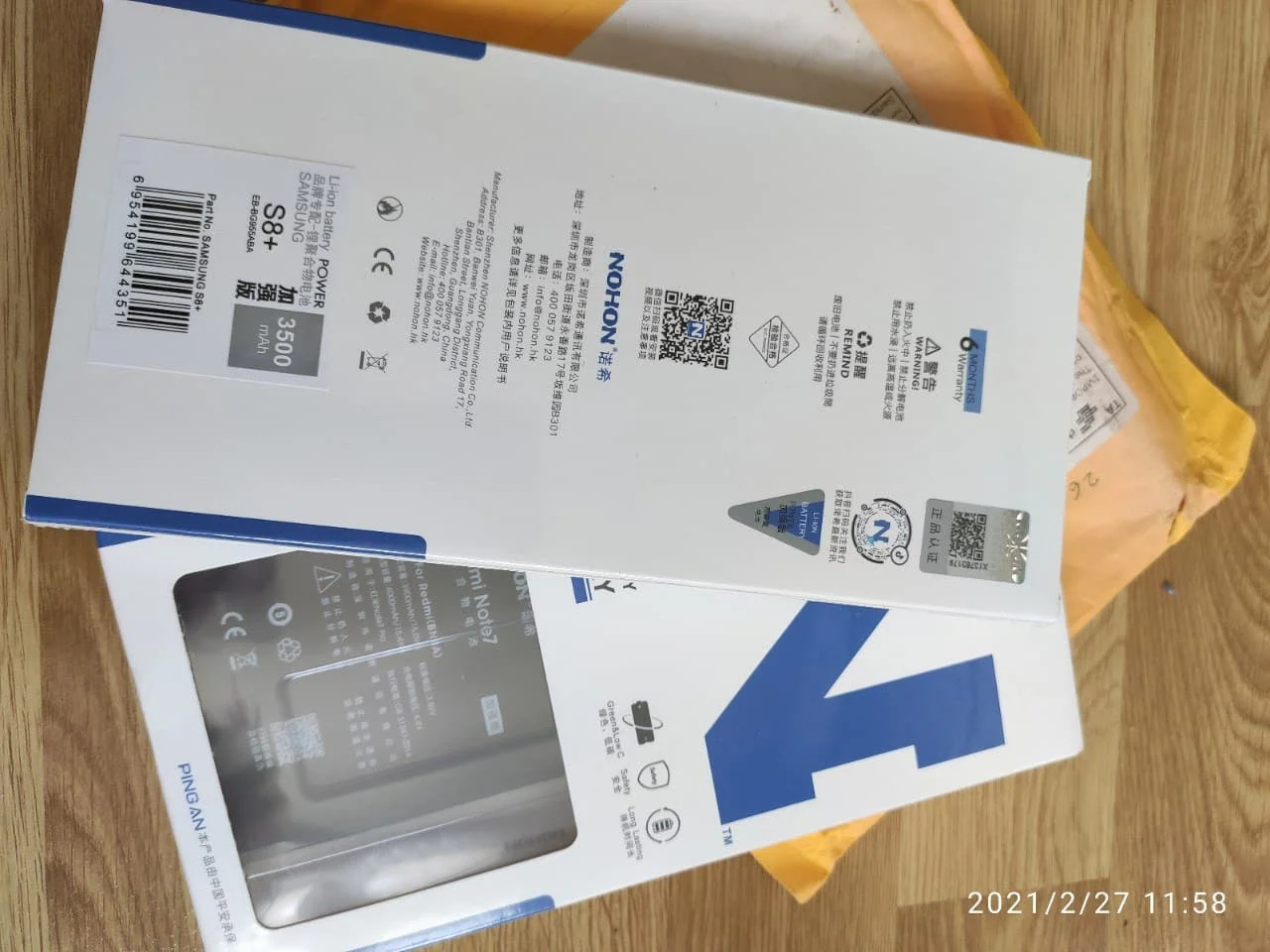 Товар двигался до Москвы c 29 января. Хотя оплачен был 15-го января.... Встал с 8 по 19 февраля на карантин таможни, как уверяют продавцы и по другим заказам. Нормально, учитывая, что попал в Новогодние китайские гуляния и ковидные препоны. Потом домчался до меня за шесть дней!! Считаю (по отслеживанию) - отлично сработала и наша Почта. Упакованы оба в стандартный оранжевый пакет с " пупырышками. Каждый аккумулятор в плотной плоской коробочке, голограмма, сертификация, то-сё... короче, см. фото. "Уровень" магазина NOHON !!! Про качество не скажу, брал про запас, пока были скидки и курс окончательно не улетел ввысь. Теперь я спокоен, продавцу спасибо.