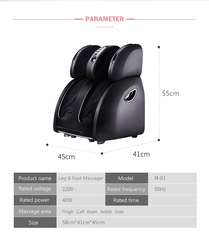 Номинальное напряжение: 220 ВНоминальная частота: 50 ГцНоминальная мощность: 40 ВтНоминальное время: 15 минутДетали массажа: бедра, икры, колено, лодыжка, стопаРазмер: 58x41x45 см