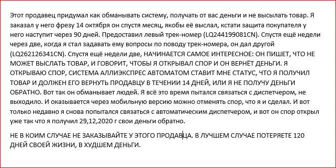 Этот продавец придумал как обманывать систему, получать от вас деньги и не высылать товар. Я купил у него фрезу 14 октября он спустя месяц, якобы её выслал. Предоставил левый трек-номер. Спустя ещё недели через две, когда я стал задавать ему вопросы по поводу трек-номера, он дал другой (LQ262126341CN). Спустя ещё недели две, НАЧИНАЕТСЯ САМОЕ ИНТЕРЕСНОЕ: ОН ПИШЕТ, ЧТО НЕ МОЖЕТ ВЫСЛАТЬ ТОВАР, И ГОВОРИТ, ЧТОБЫ Я ОТКРЫВАЛ СПОР И ОН ВЕРНЁТ ДЕНЬГИ. Я ОТКРЫВАЮ СПОР, СИСТЕМА АЛЛИЭКСПРЕС АВТОМАТОМ СТАВИТ МНЕ СТАТУС, ЧТО Я ПОЛУЧИЛ ТОВАР И ДОЛЖЕН ЕГО ВЕРНУТЬ ПРОДАВЦУ В ТЕЧЕНИИ 14 ДНЕЙ, ИЛИ Я НЕ ПОЛУЧУ ДЕНЬГИ ОБРАТНО. Вот так он обманывает людей. И оказывается через мобильную версию можно отменять спор, что я и сделал. И вот только недавно я снова попытался связаться с автоматическим диспетчером, и вот он спор открыл уже так что я получил 29,12,2020 г свои деньги обратно. НЕ В КОИМ СЛУЧАЕ НЕ ЗАКАЗЫВАЙТЕ У ЭТОГО ПРОДАВЦА. В ЛУЧШЕМ СЛУЧАЕ ПОТЕРЯЕТЕ 120 ДНЕЙ СВОЕЙ ЖИЗНИ, В ХУДШЕМ ДЕНЬГИ.