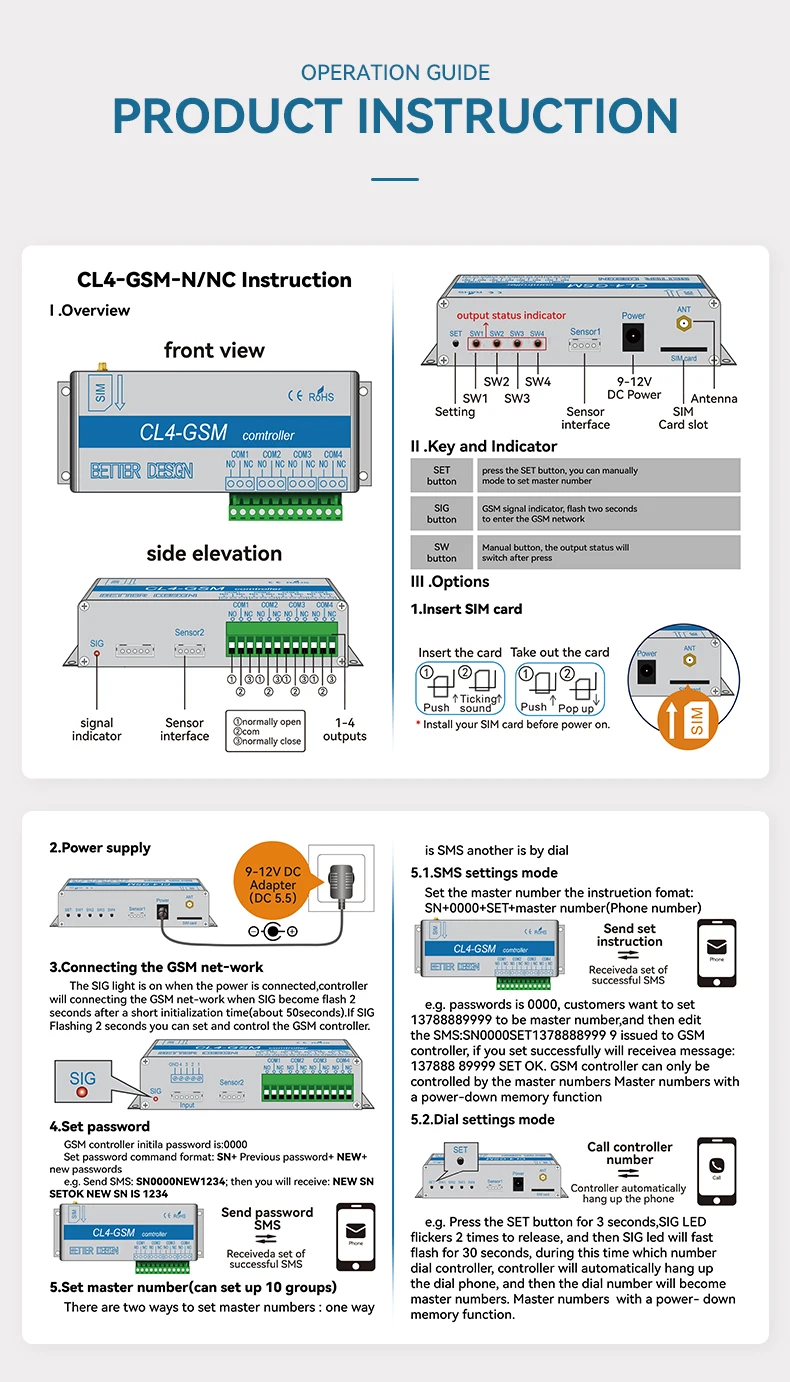 1, это устройство поддерживает только 2G sim-карты, поэтому поддерживает только GSM сеть, не поддерживает 3G,4G sim-карты. Перед размещением заказа, пожалуйста, убедитесь, что телекоммуникационная компания вашей страны поддерживает 2G sim-карты, в противном случае устройство не будет работать, или, возможно, только позвоните, нельзя использовать SMS для управления;