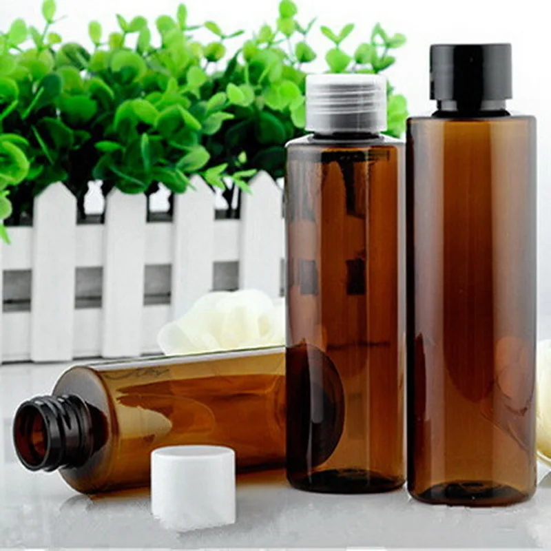 Пустая бутылка из ПЭТ янтарного цвета, 30 шт.лот, 100 мл, 120 мл, 150 мл, коричневая, с плоским плечом, пластиковая бутылка с черной крышкой и внутренней пробкой