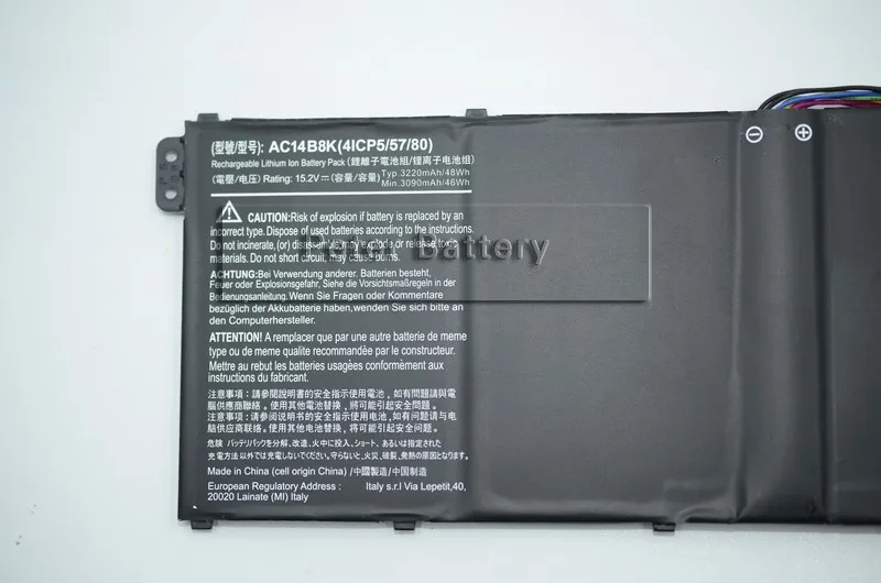 Для ноутбуков Acer AC14B8K Аккумуляторы могут заменить следующий номер детали: Для ACER 4ICP5/57/80 KT.0030G.004 AC14B8K KT.0040G.004 Аккумулятор для ноутбука AC14B8K совместим со следующими моделями: Для ACER Aspire E3-111 Aspire ES1-531-C77Q Aspire E3-112 Aspire ES1-531-C7KL Aspire E3-112M Aspire ES1-711 Aspire ES1-311-C5PG Aspire R3-131T Aspire ES1-411-C7K0 Aspire R7-371T Aspire ES1-421-239N Aspire V3-111 Aspire ES1-421-28W8 Aspire V3-111P Aspire ES1-431-C1EL Aspire V3-112P Aspire ES1-431-C2V6 Aspire V3-371 Aspire ES1-431-C586 Aspire V5-122 Aspire ES1-431-C9Y6 Aspire V5-122P Aspire ES1-511 Aspire V5-132 Aspire ES1-512 Aspire V5-132P Aspire ES1-521-28Y3 Chromebook 13 CB5-311 Aspire ES1-521-295T Дорожный B115-M Aspire ES1-531-C13G TravelMate B115-M B115-MP Aspire ES1-531-C1ZS Дорожный B115-MP