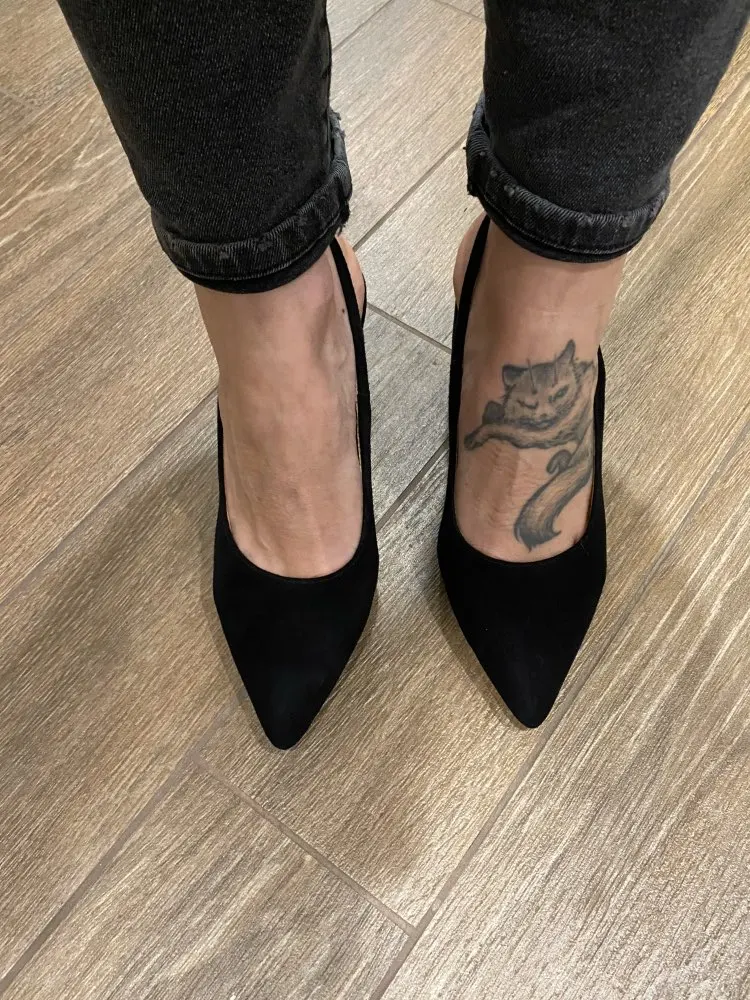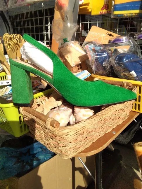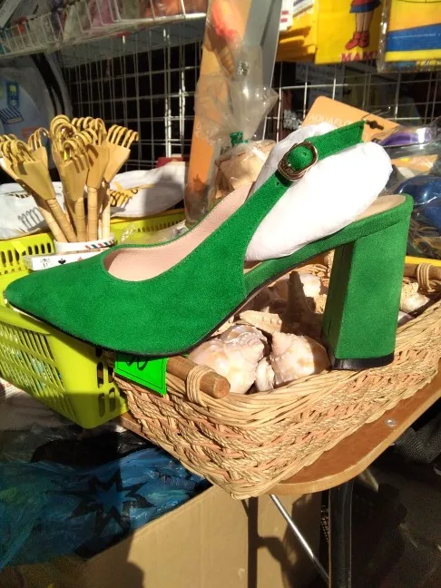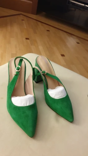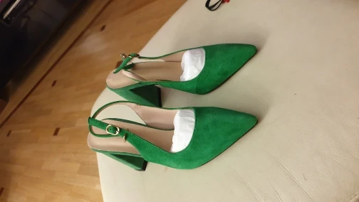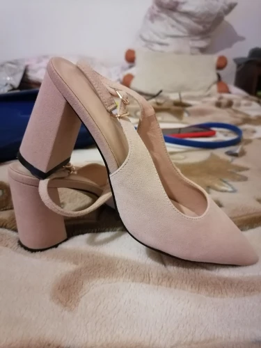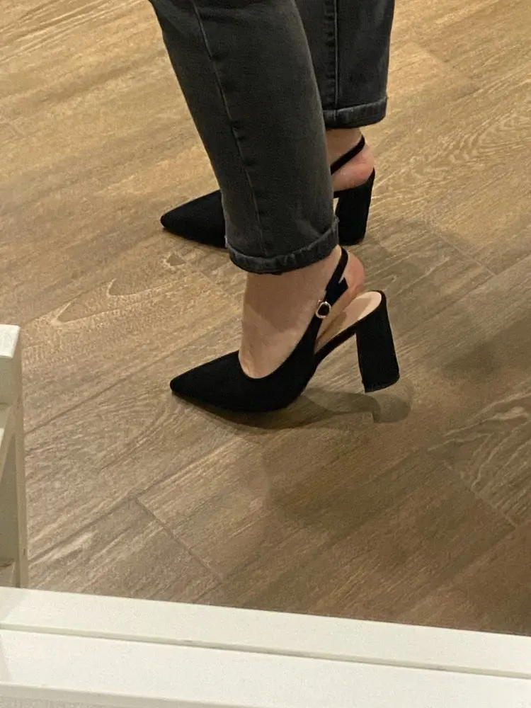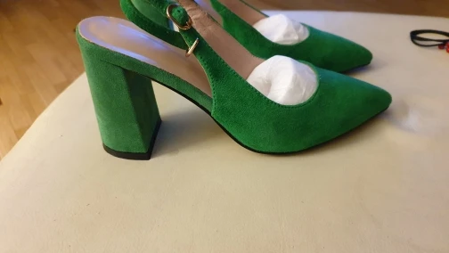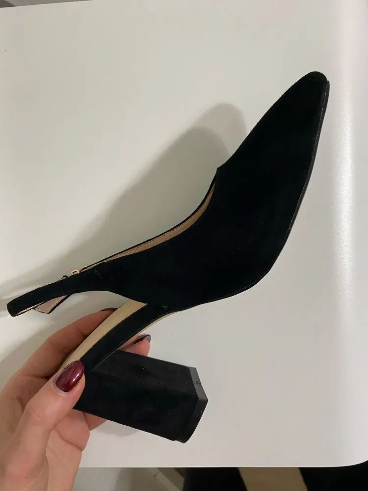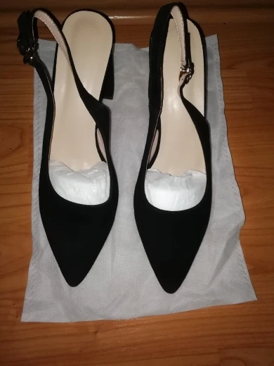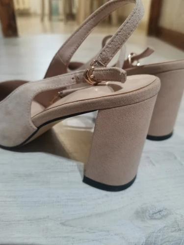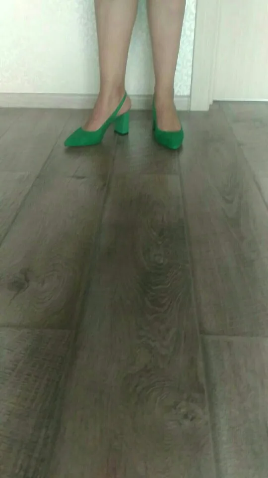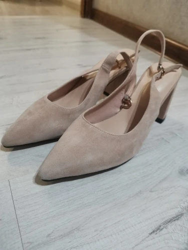 Выглядят туфли хорошо, размер подошёл (рос.38 взяла 8.5). Забавно, материал верха носа туфель действительно похож на натуральную замшу, но каблук однозначно нет!