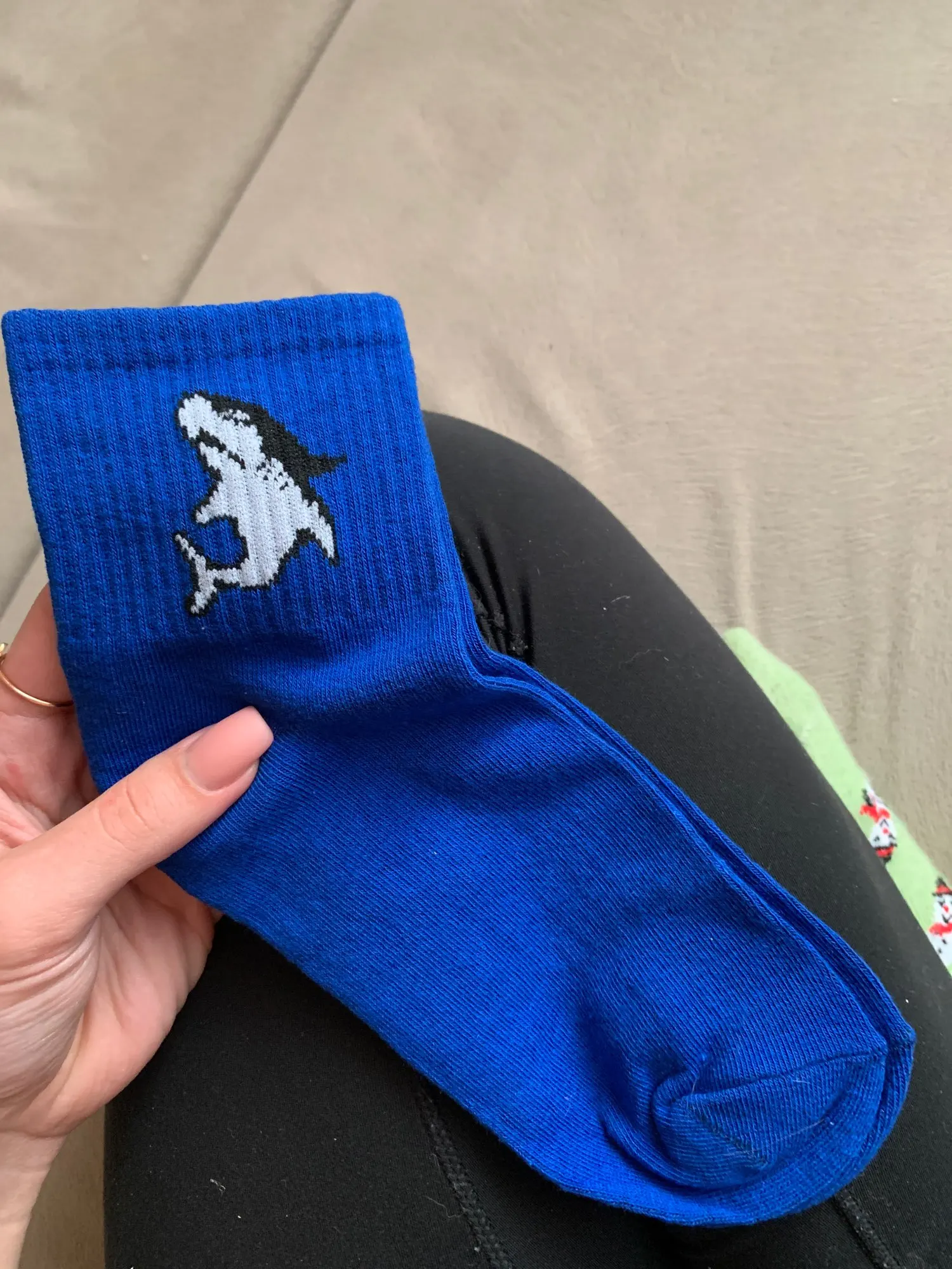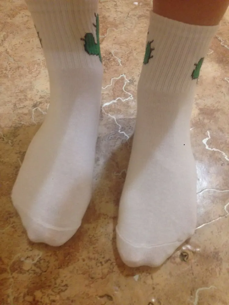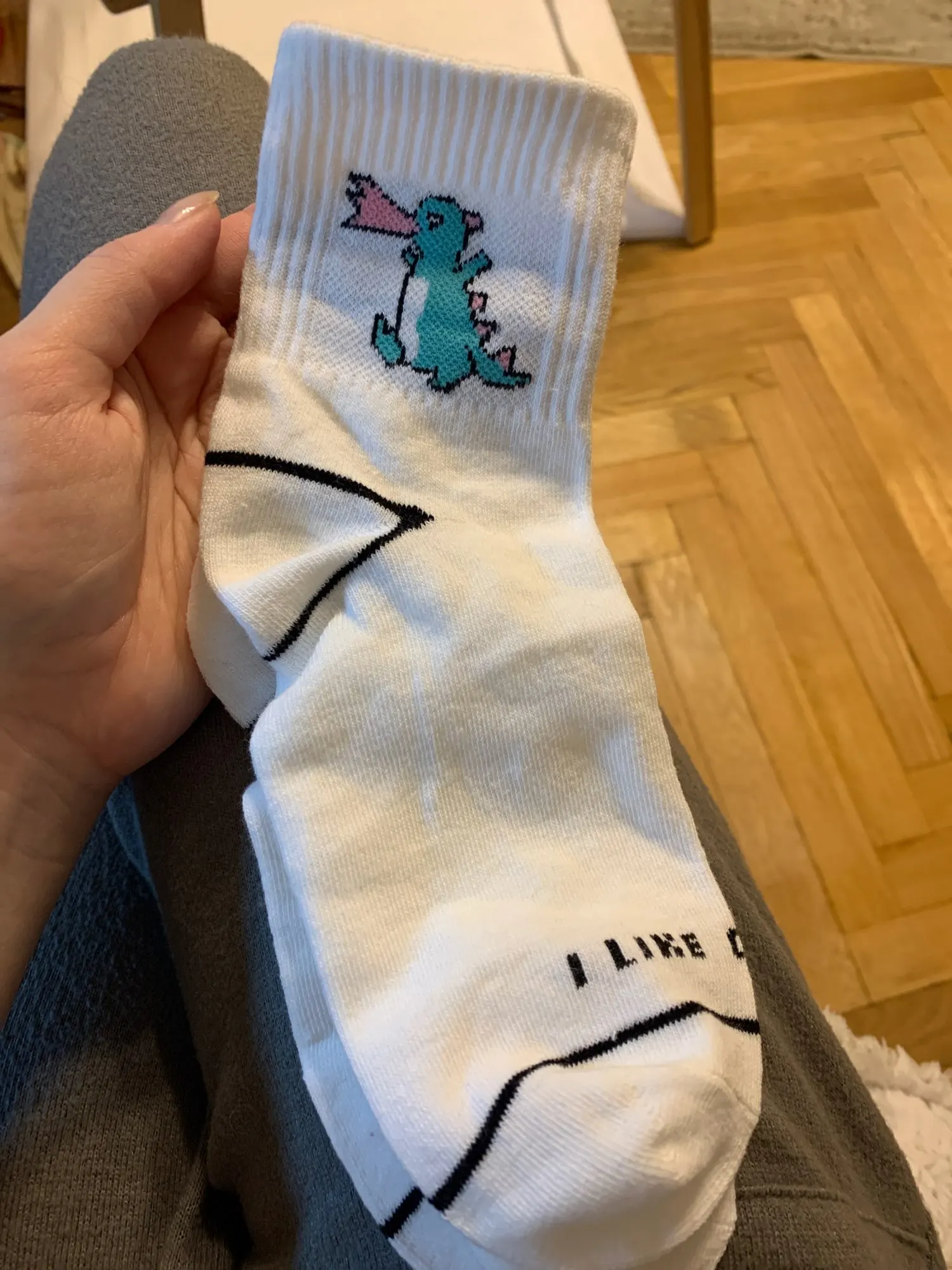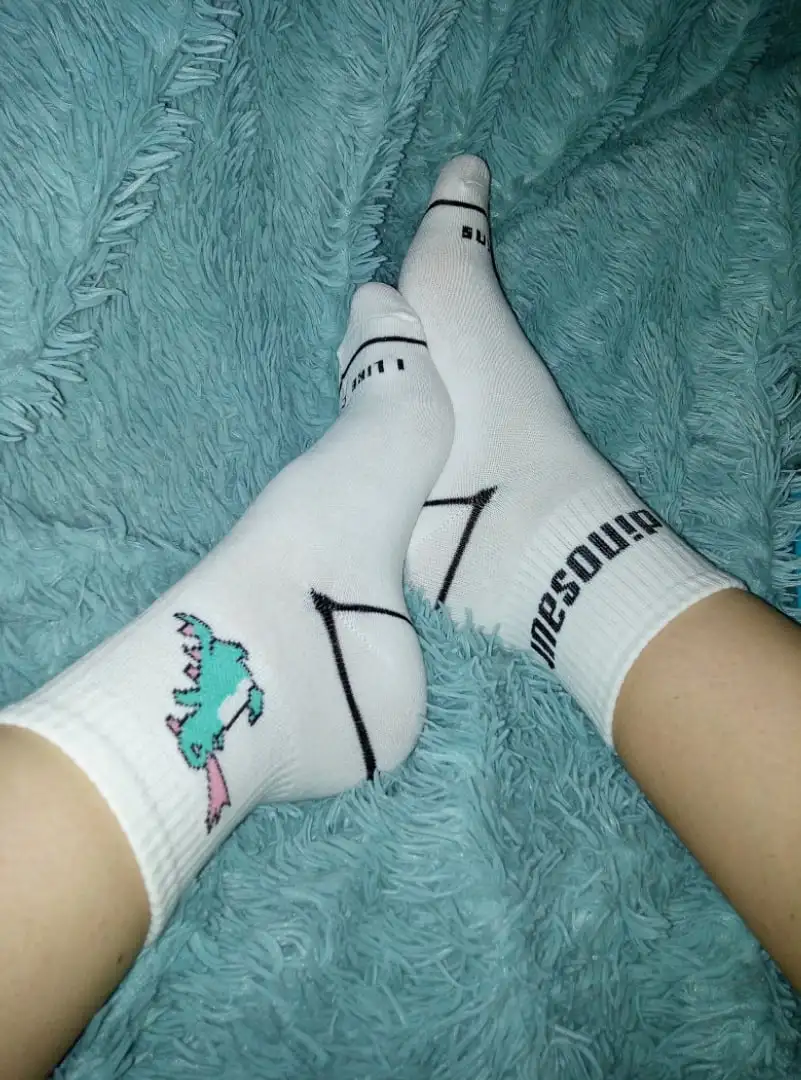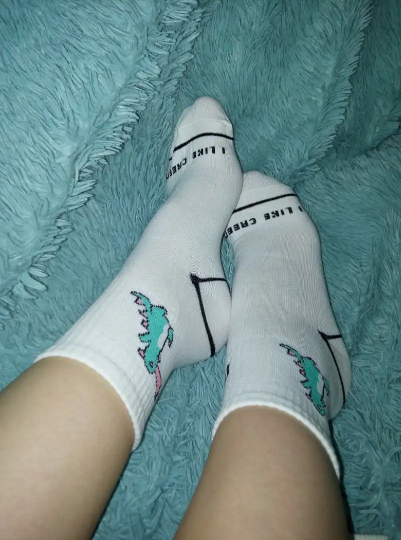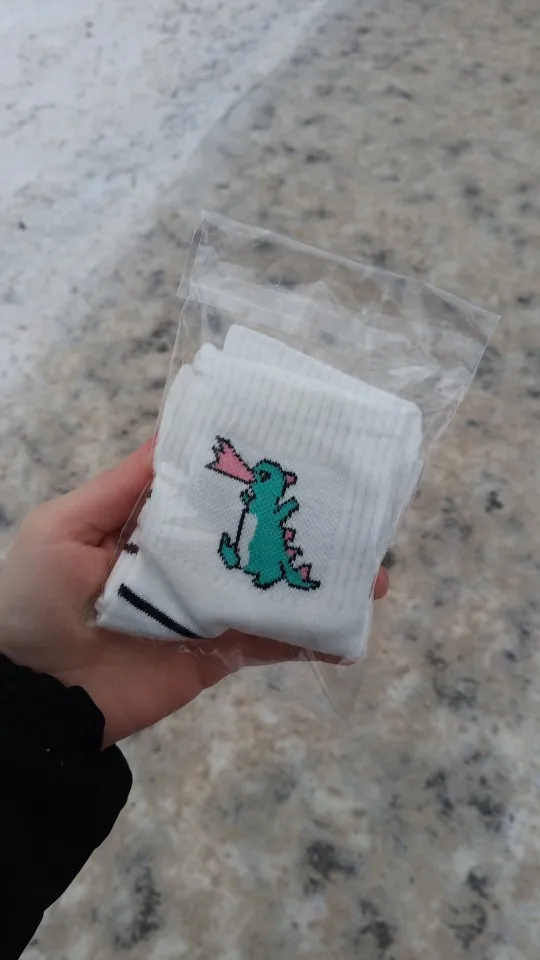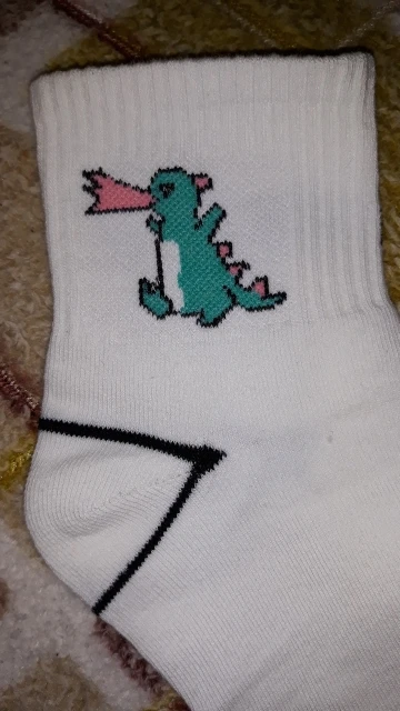 Носочки потрясающие. Материал качественный, не просвечивает. Принт равномерный, без дефектов. Ножкам комфортно и тепло. Немного расстраивает, что динозаврики на обоих носках с одной и той же стороны. То есть, на правой ноге он с лицевой стороны, а на левой ноге - с внутренней. Но это не так уж и страшно. Доставка быстрая, меньше месяца (с 11-13 октября до 30 октября). В целом, заказом очень довольна!