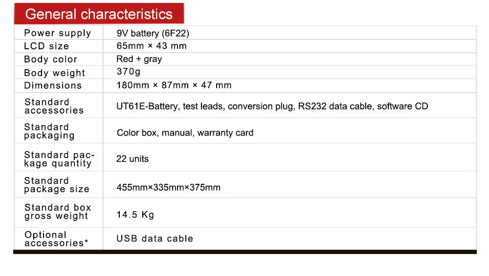 1. Большой ЖК-экран. 2. Аналоговый указатель с высоким разрешением. 3. Полная защита от перегрузки. 4. Хранение данных, REL, измерение пикового значения. 5. Индикация низкого заряда батареи, подсветка и режим сна. 6. Внешний интерфейс поддерживает RS-232C и usb-кабель. Серия UT61 может измерять напряжение и ток переменного/постоянного тока, сопротивление, диод, непрерывность цепи, емкость, частоту, температуру, hFE, электромагнитную индукцию и т. д. Серия UT61 соответствует стандарту IEC61010: CAT. III 1000 В, CAT.IV 600 В; Они широко используются в промышленном производстве и обслуживании, технологических исследованиях и дизайне, университетском обучении (лаборатория, учебные заведения) и автомобильной промышленности.