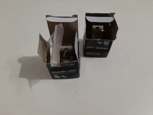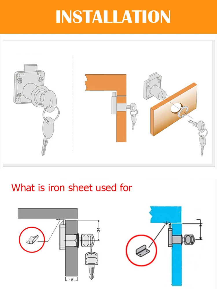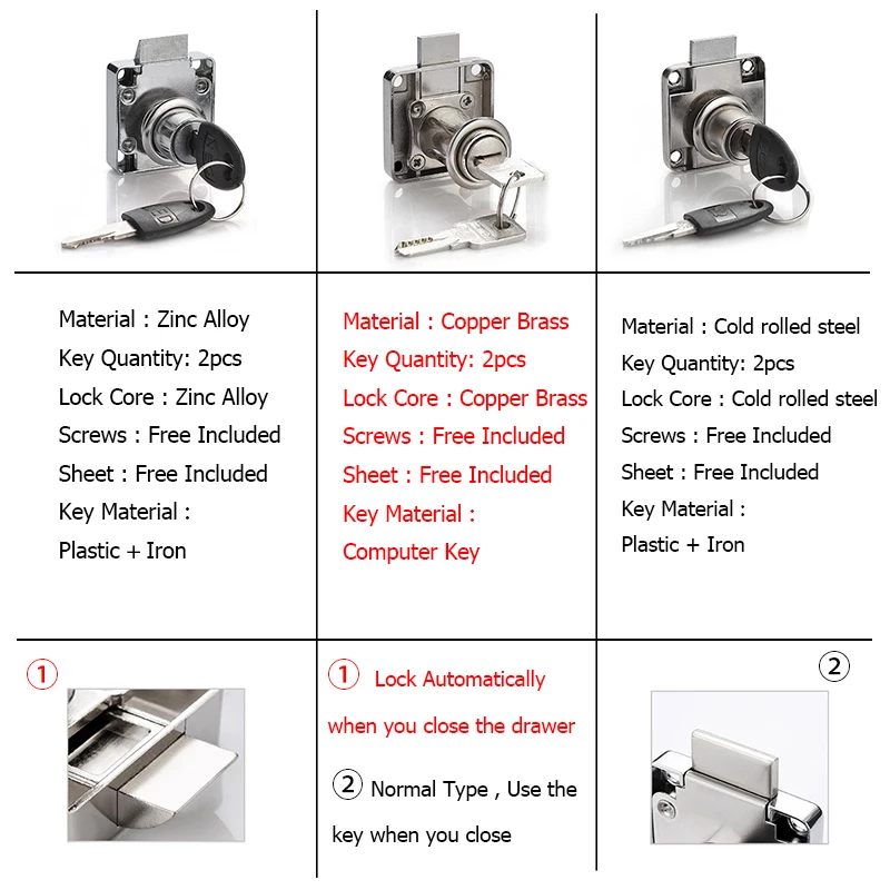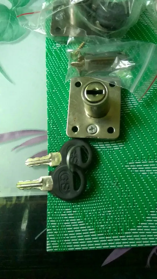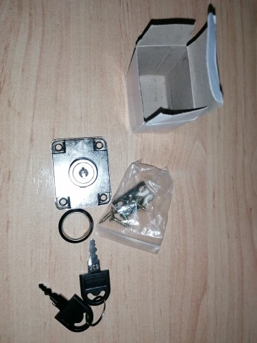 Я прибыл правильно. Замок прост, как показано на фотографиях изделия. Он поставляется с небольшой командой, чтобы сделать закрытие, и поставляется с их соответствующими деревянными винтами, он также приносит хромовое украшение, чтобы соответствовать отверстию лампы (он имеет очень маленькое крыло, поэтому, если вы пропустите диаметр сверла, этого будет недостаточно, чтобы покрыть его. Не ожидайте блокировки безопасности. Нет, но это прекрасно подходит, чтобы держать ящик вдали от посторонних рук.