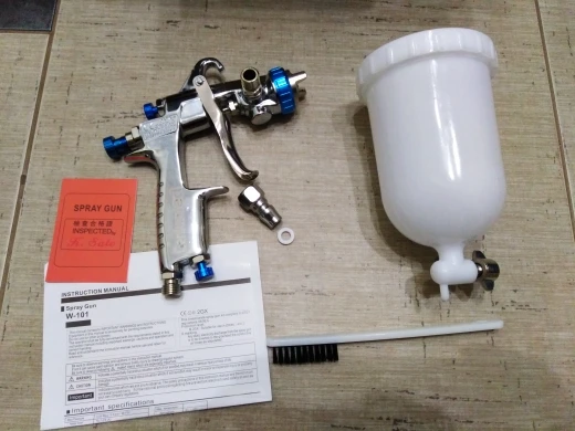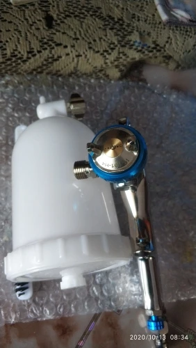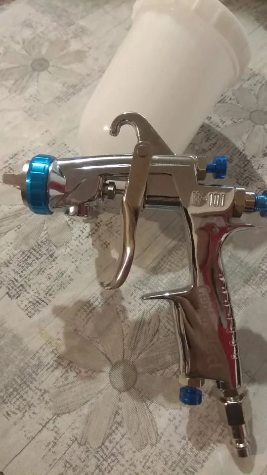 За эти деньги очень хороший пистолет. Недостатки: 1) Непривычное расположение бачка сбоку - центр тяжести. 2) При наклонах краска выливается из бачка При вводе в эксплуатацию не промыл воздухопровод. Поэтому две капельки масла вылетели и оставили кратер. Пришлось исправлять. Кто-то пишет, что у него факел восьмеркой. Это руки у него восьмеркой. При правильной настройке давления и количества окрасочного материала факел хороший, наполненный, ровный.