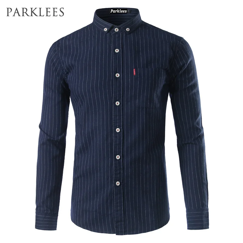 Мужская хлопковая рубашка на пуговицах, Повседневная приталенная рубашка в полоску с длинным рукавом, 2017