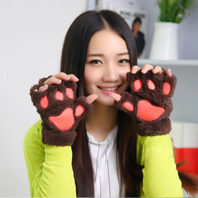 Варежки женские, с пушистым медведем из мультфильма, зимние, с полупальцами, плюшевые, кошачья лапа с когтями, G22, теплые, без пальцев