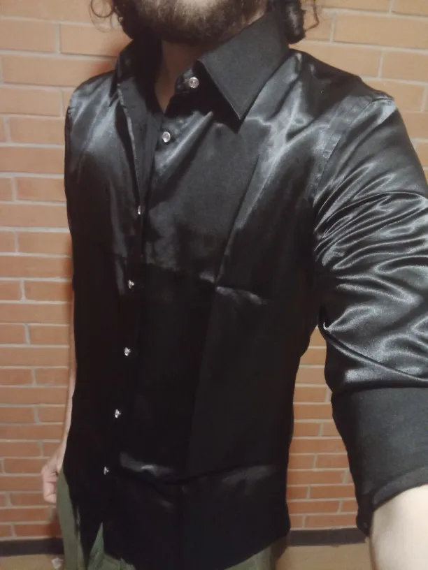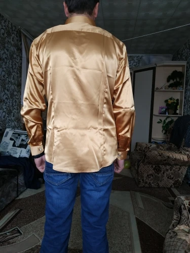 Рубашка красивая, красивый блестящий материал с маленькими пуговицами со стразами. С другой стороны, размер рубашки очень маленький, потому что мой муж носил M, я заказал размер L, и он слишком узкий. Я попрошу обменять размер XL.