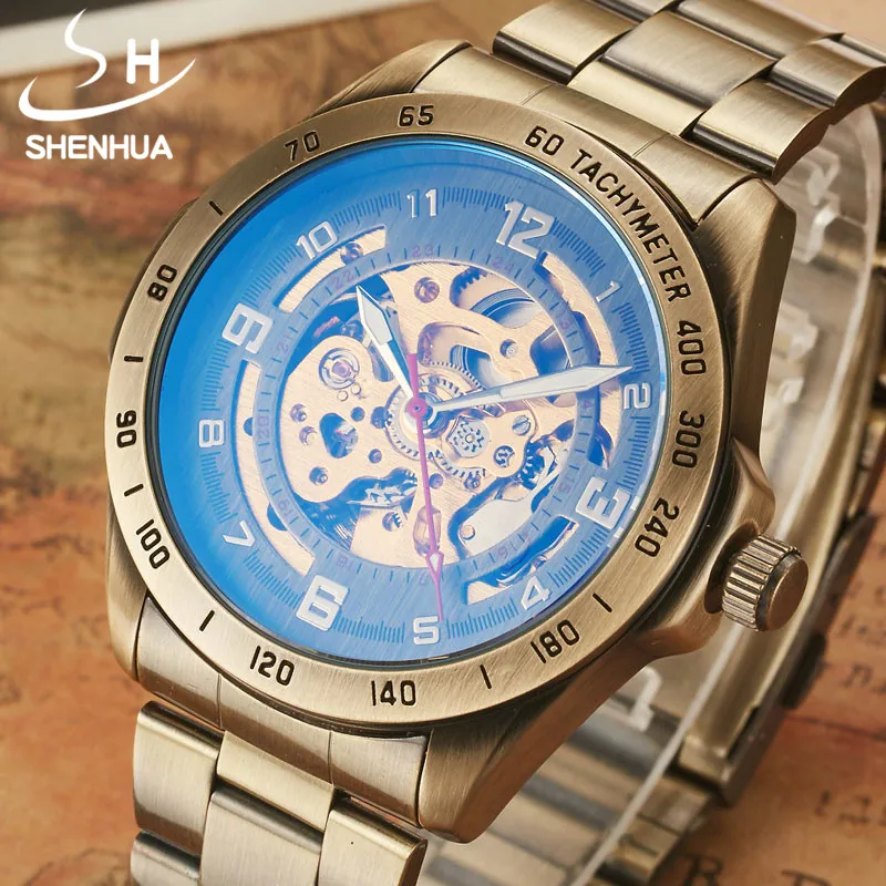 Мужские механические часы-скелетоны с автоподзаводом SHENHUA, бронзовые полностью Стальные наручные часы в стиле стимпанк в стиле ретро