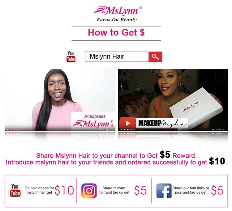Поделитесь mslinn hair на свой канал, чтобы получить награду $5! Представить mslinn волосы своим друзьям и заказал успешно, чтобы получить $10