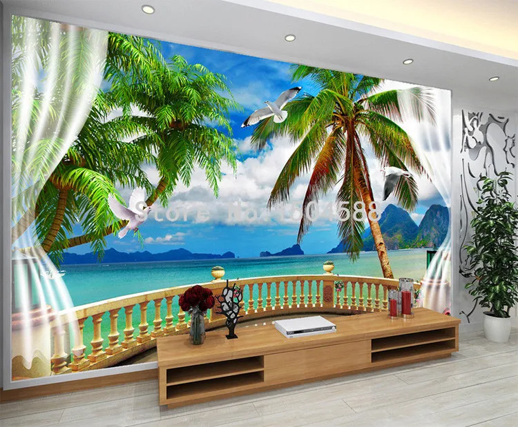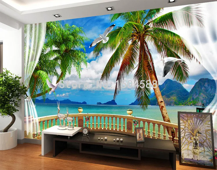 Голубое небо пляж кокосовые пальмы 3D балкон занавес фото обои гостиная отель спальня Уютный домашний Декор 3D росписи