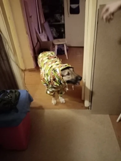 коротковат по длине по животу размер 22, хотя по спине нависает на хвост, на собаку спина 50см, ог 66, шея 42, рост в холке 50см. без подкладки, материал прорезиненый как будто, возможно будет цепляться за шерсть. затяжки на шее нет, длина штанин на собак невысокого роста. доставка до МО 12 дней