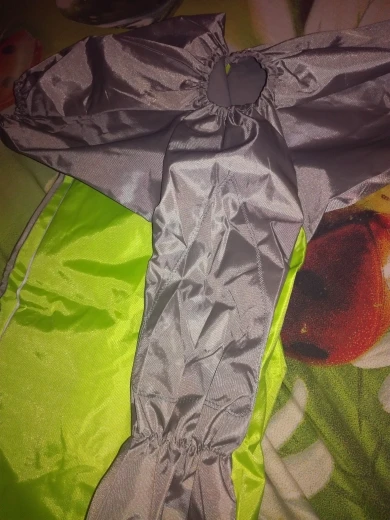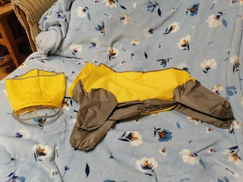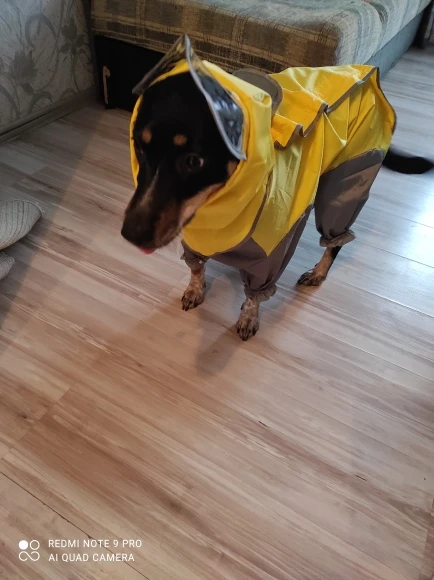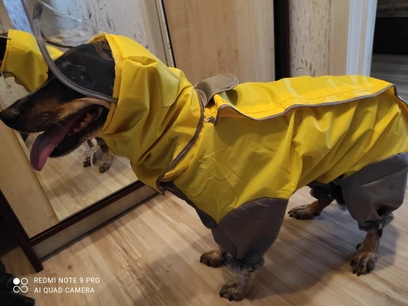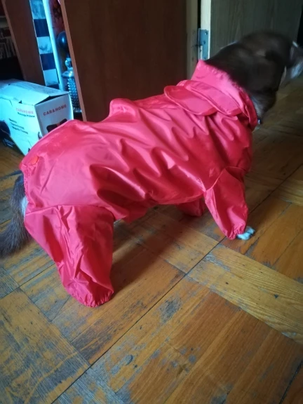 Комбез в целом неплохой. Единственное, что внутри нет никаких подкладок мягких. И, так как непромокаемая, то будет в ней душновато. Плотная. Пошито ровно. Унисекс, есть на животике специально прошитое место, где можно вырезать, если у вас кобель. Имеется съемный капюшон-воротник. Теперь будем ждать дожди и готовиться к тест драйву. Позже дополню отзыв. На гриффона около 4 кг сел отлично (спинка у нас 30), слегка свободно, но это лучше, чем впритык. Зимой можно будет теплый свитер поддеть под комбез. Рукава не очень длинные. Но в целом рекомендую товар // overall it is not too bad. It has not soft fabric inside. Quality is good. It is for both males or females : there is a special spot on the belly where you can cut a piece if you have male. Fitted okay on my griffon about 4 kilos. Feels a little bit larger but imo it is even better so I can put on a sweater under it for winter walks. I recommend this item