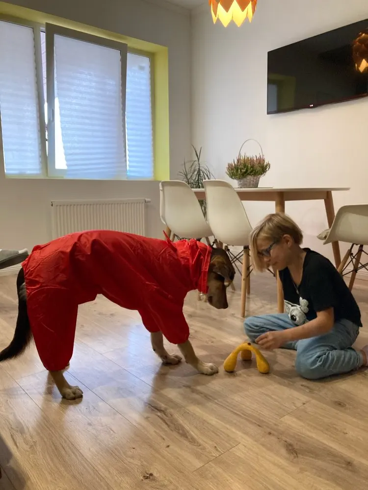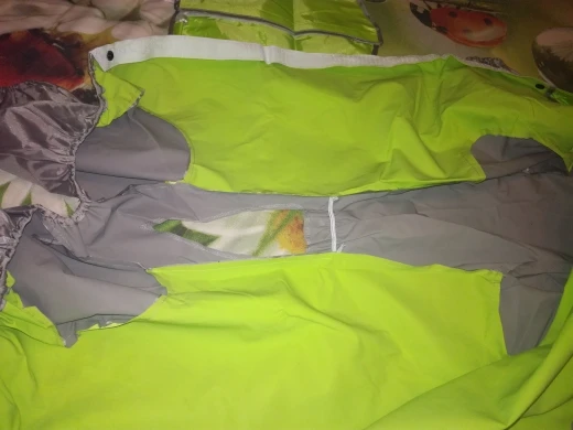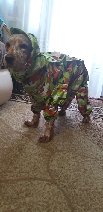Невероятное качество, все продумано. Нет запаха. Очень крепкие липучки, в дополнение тугие кнопки, шлем крепится липучкой! Прям очень вкусный комбез. На взрослую девочку бигля (не коренастая, но плотненька) подошел размер 18 - как влитой, но не впритык. резинки у штанин отличные, не свалятся. Конечно, собачке (наверное особенно шерстяной) в этой вещи долго не пробегать, и летом будет не комфортно. Это совсем не дышащая вещь. На слякоть в межсезонье и полагаю не больше 40 минут в ней выдержит четвероногий. Но вещь отличная просто! За такие деньги - просто подарок! Пришел быстро, до Смоленска меньше месяца