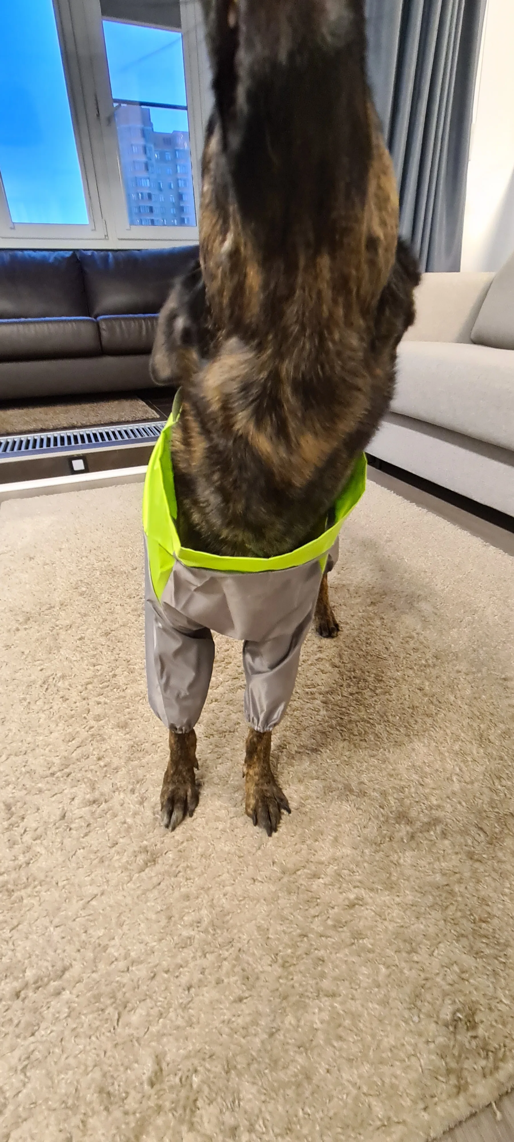 Отличный комбинезон! Подошёл «на ура» У меня бернский Зенненхунд весом в 55кг длина по спинке 80см.Он очень доволен комбедом))Швы отлично прошили. Без запаха. Продавец молодчинка отправил в день заказа. Дошёл до Киева за 2 недели. НОвой почте огромный минус- лежал на отделении 5 дней,без уведомления о доставке! А так товар рекомендую!!!