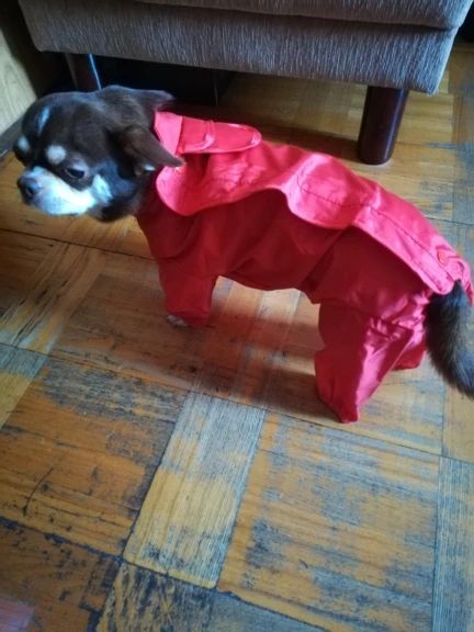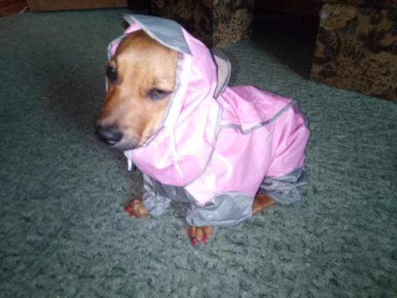Дождевик хорошего качества, но моя Лорри совсем не хочет одевать(((( Нам большеват, по этому она просто с него вылазит. брала размер 12 на Шпица 2,5 кг.