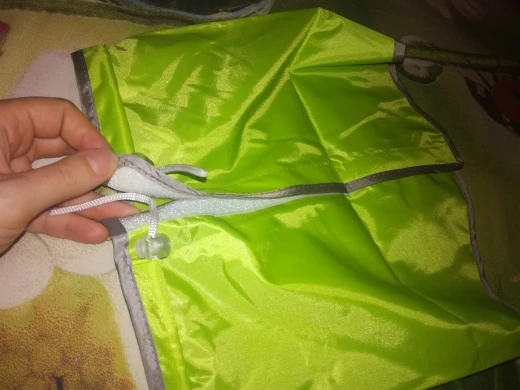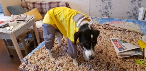 На Веста подошёл 16 размер, на лапках очень тугие резинки, не знаю будет ли мой из-за этого ходить в нем нормально. Доставка почти 3 месяца, заказала 11 ноября пришёл 29 января. Капюшон можно отстегнуть, дождевик никак не проветривается, собака будет потеть.