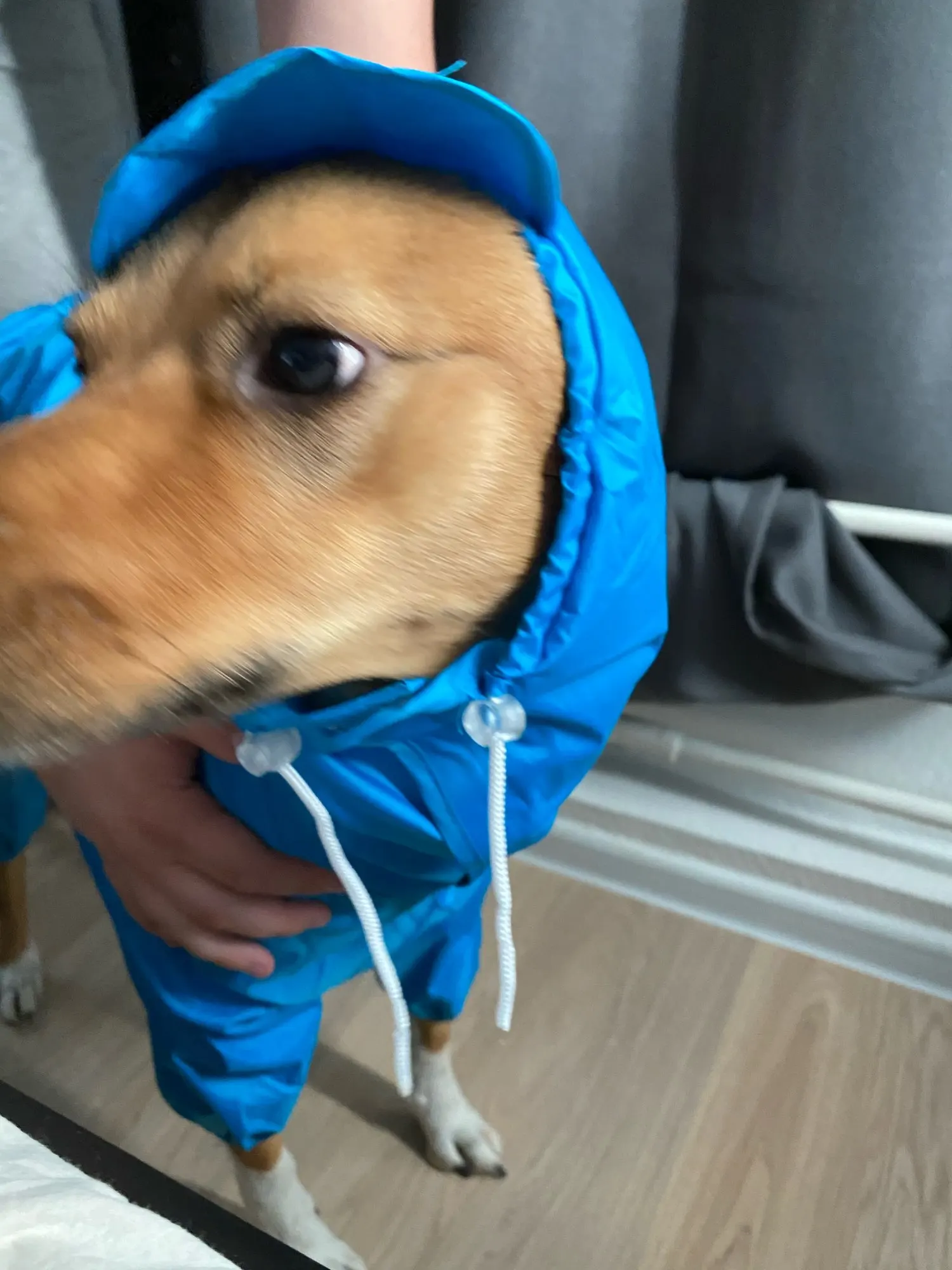 очень понравился дождевик. плотная ткань, в дождь правда пока не надевала, только дома примеряла. малому шпица 4кг идеально подошел, удобная застежка сверху