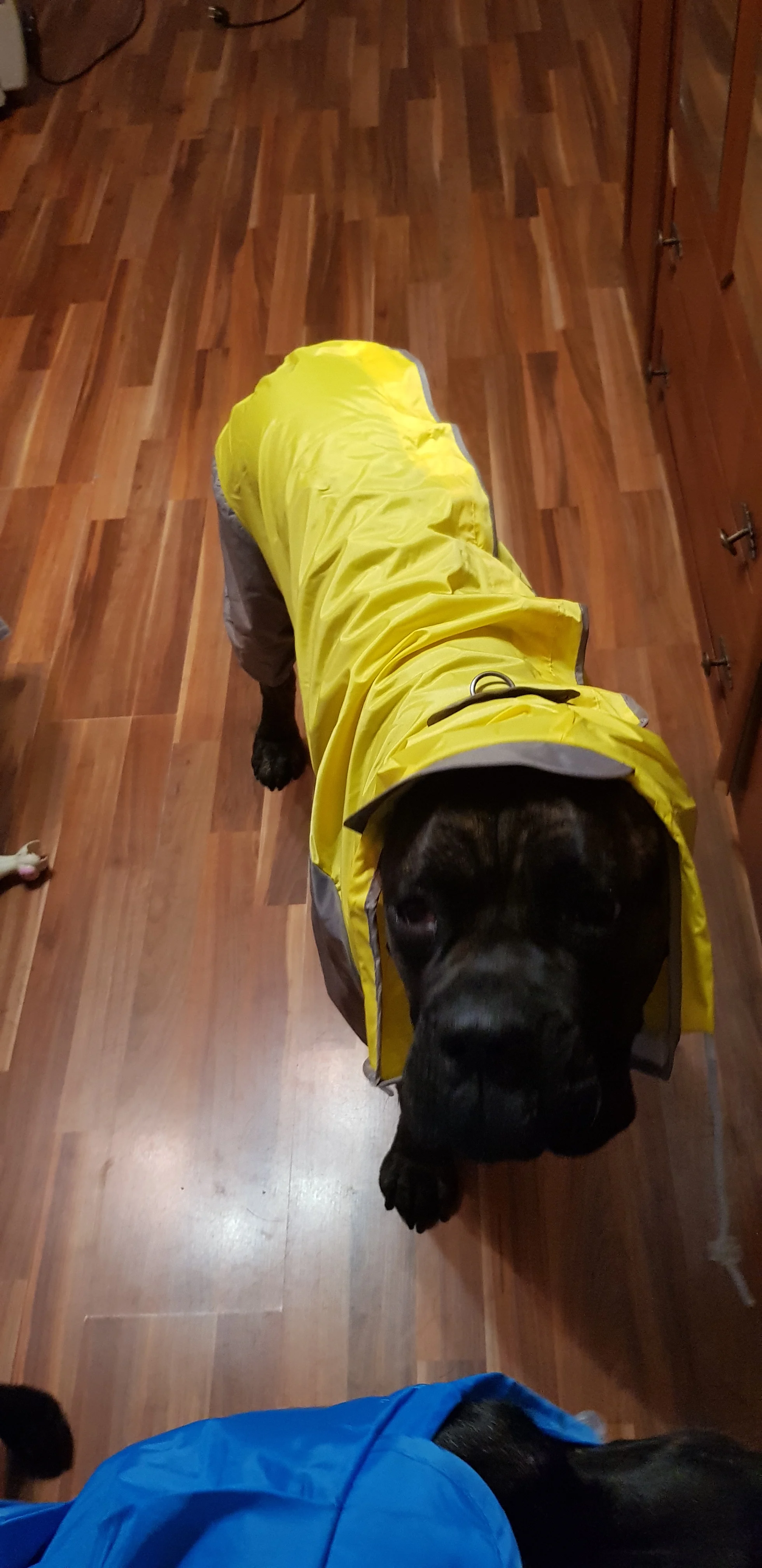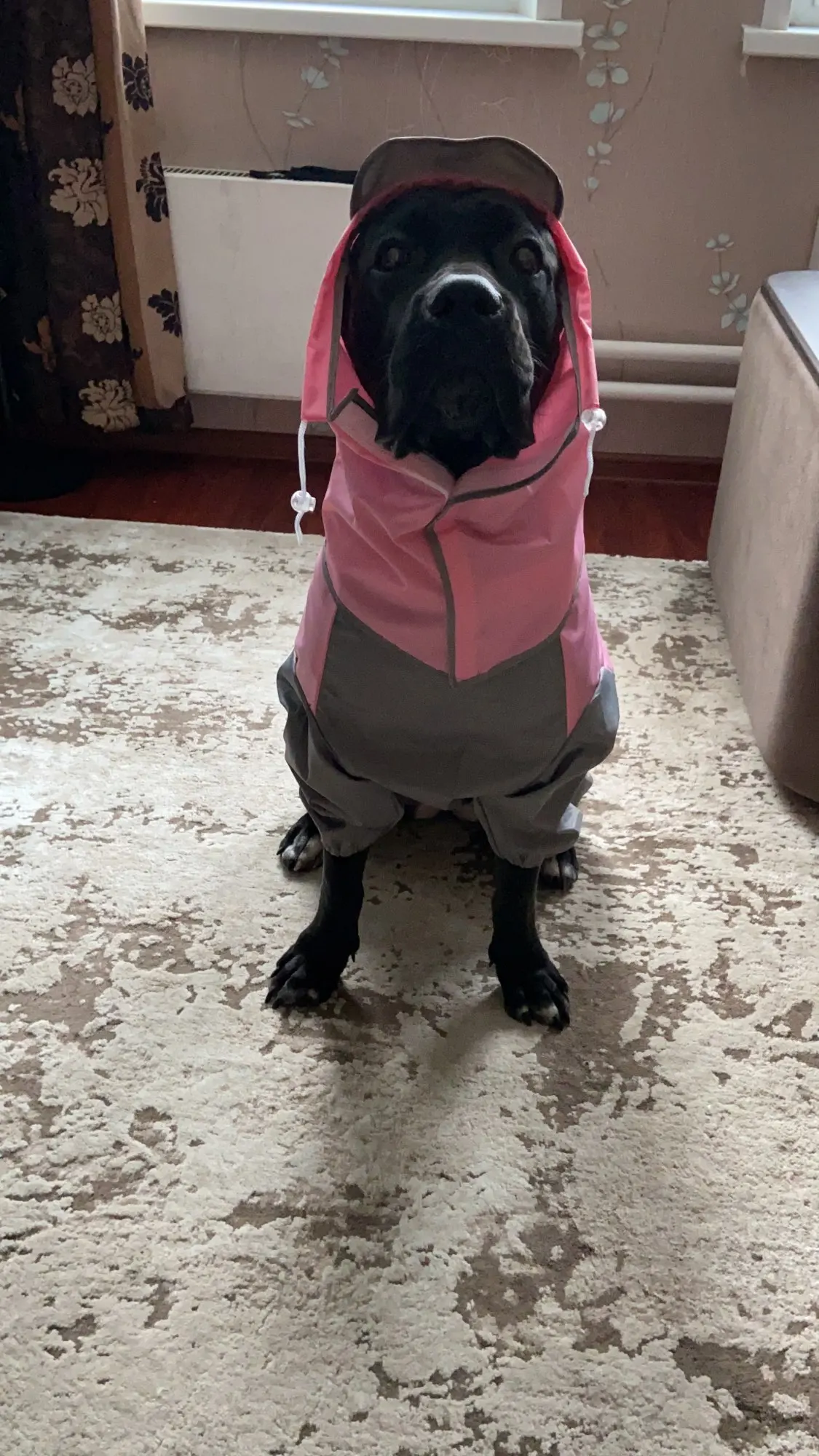 Хорошая куртка. Я должен изменить отверстие для мочи, потому что сейчас слишком маленькое отверстие. Капюшон тоже отличный. 60 см сзади и Лабрадор/боксеры/указатель микс. Определенно стоит купить.