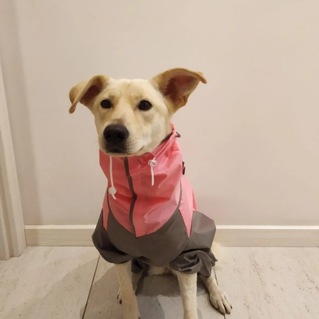 Самый лучший дождевик, влагу не пропускает, красивый. На золотистого ретривера подошёл 28 размер