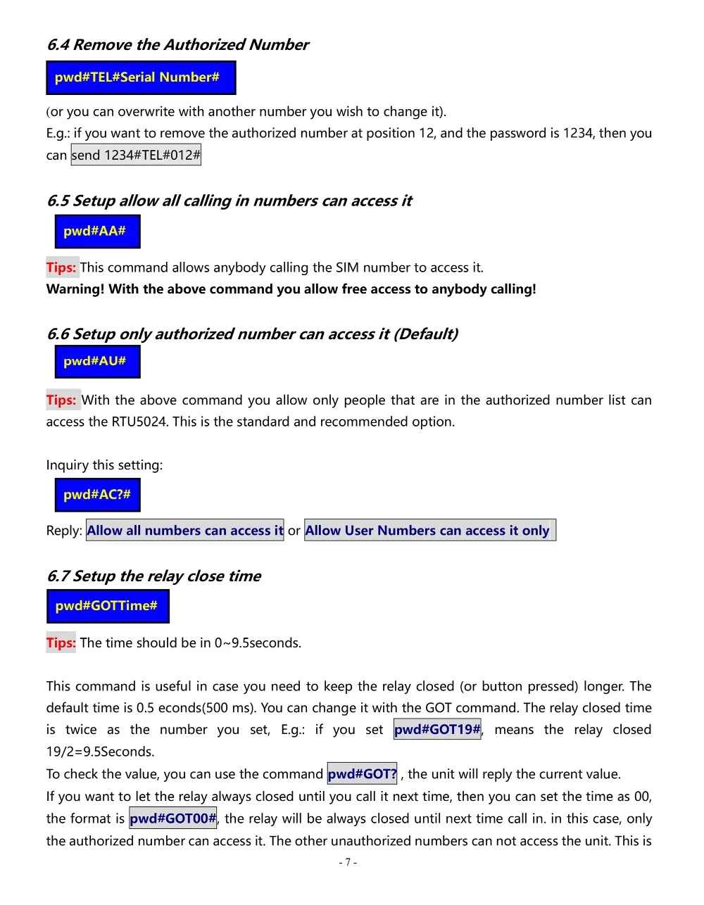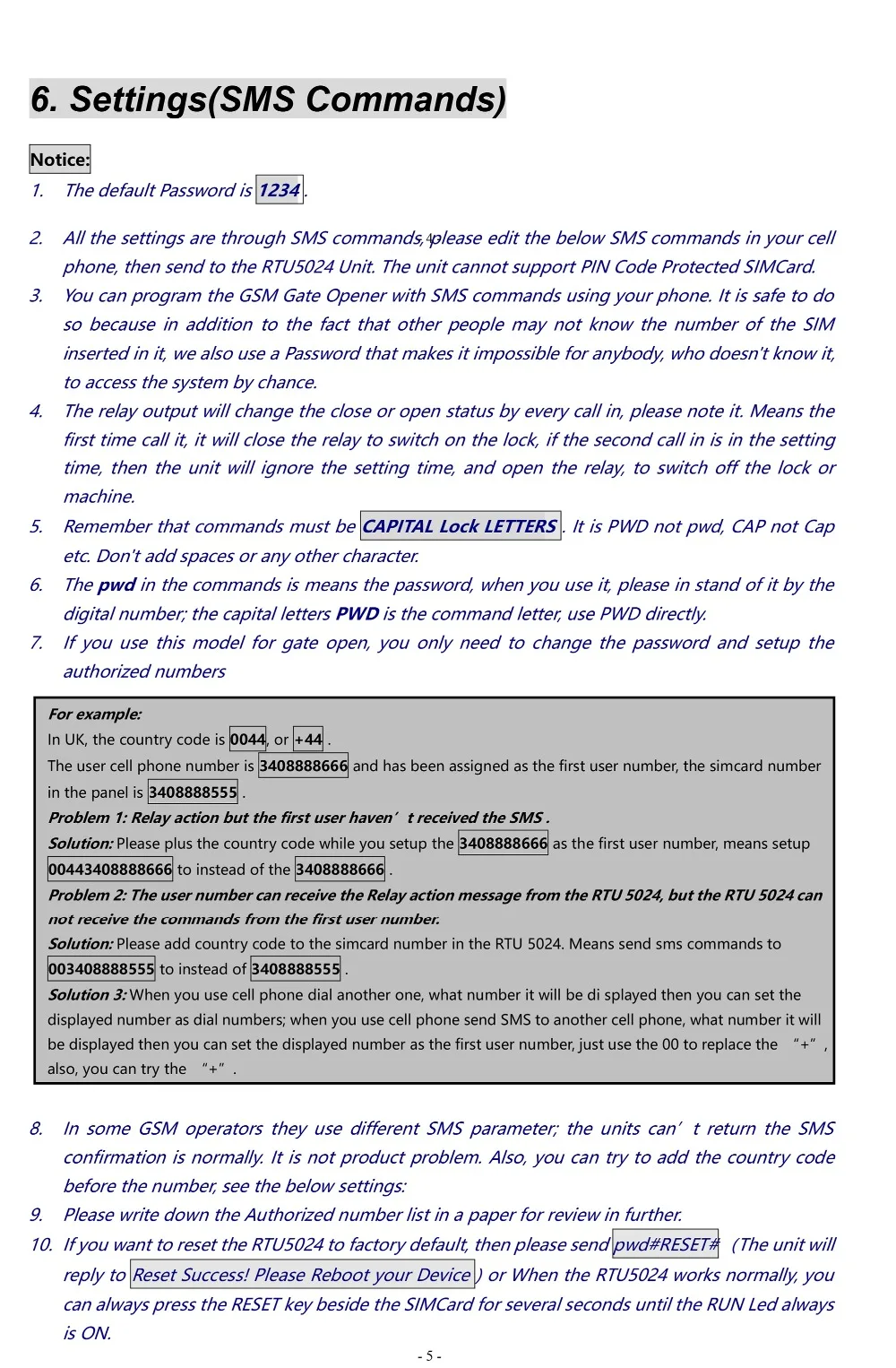 Например, если вы используете устройство открывания ворот RTU5024 GSM для открытия/закрытия гаражных ворот своими членами семьи, вам нужно всего лишь 2 ~ 5 SMS-команд.