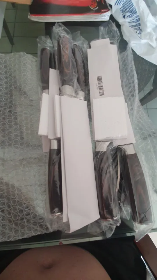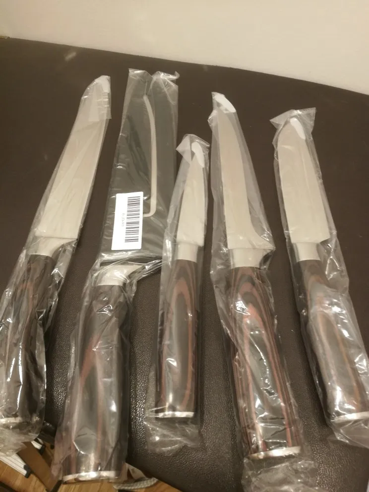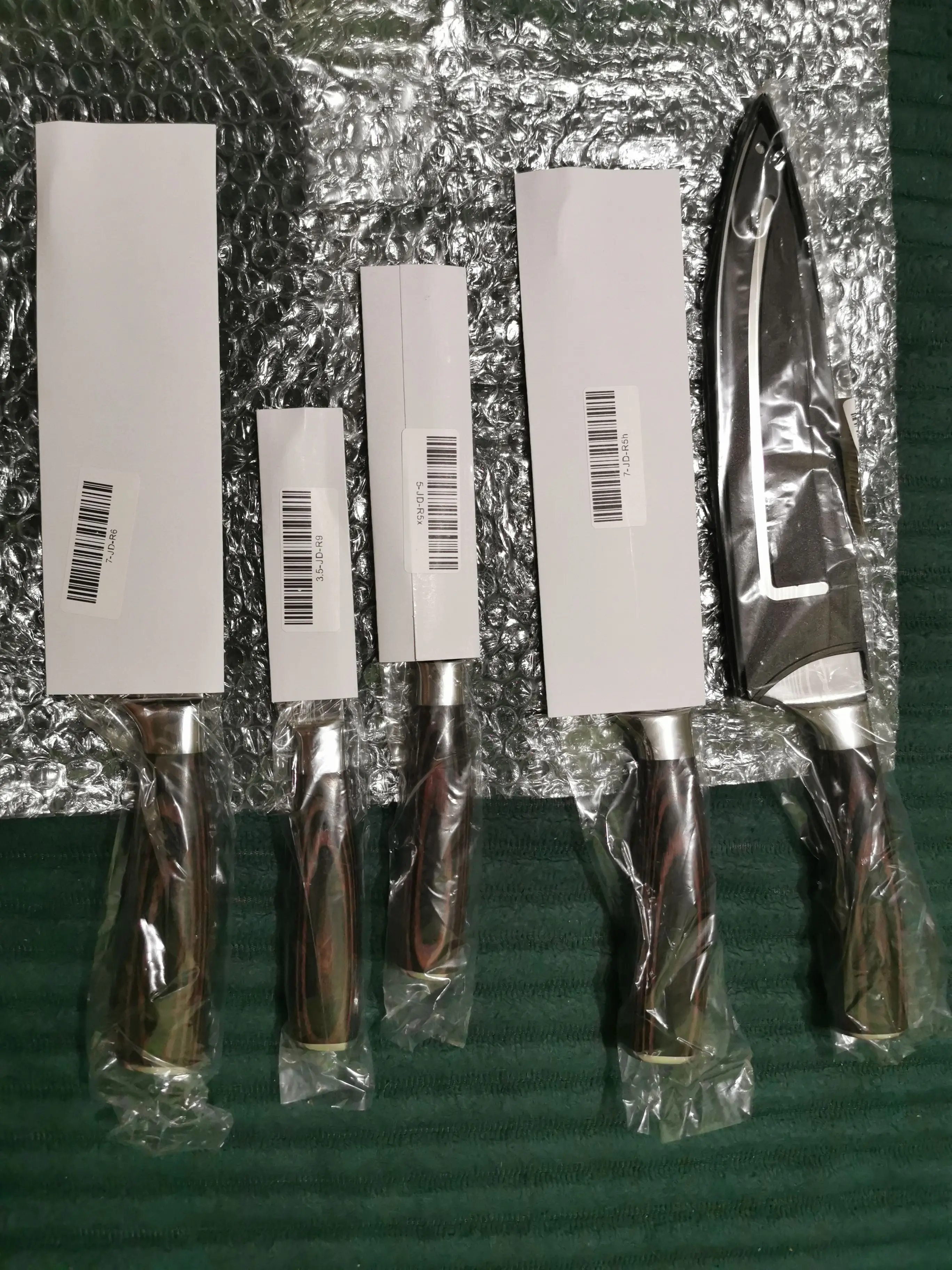 Пришли в мятой коробке, но внутри всё целое, в пакетиках, картоночках, и что то даже в защитных чехольчиках из пластика. По качеству на первый взгляд сталь слабовата. Но по факту использования скажу позже. Брал набор 10 ножей. по итогу выходит грубо по 400 за ножик.