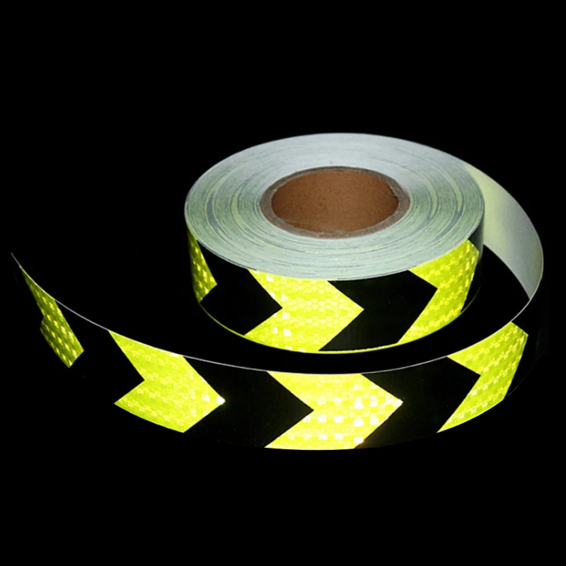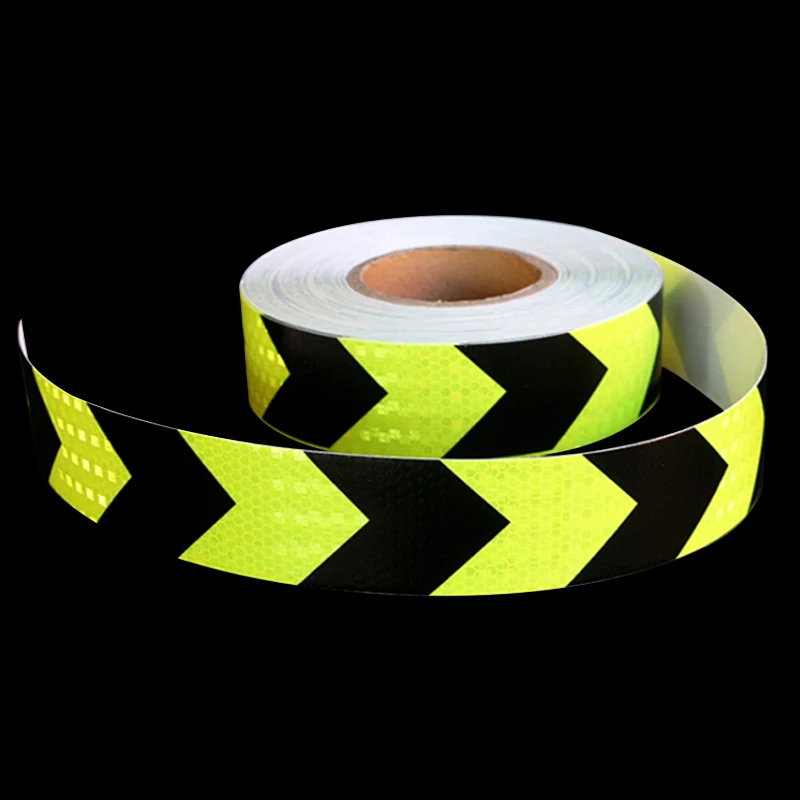 Флуоресцентная светоотражающая лента со стрелками из ПЭТ желтого и черного цвета, светоотражающая предупреждающая лента, хорошо вязкая, водонепроницаемая, длительный срок службы