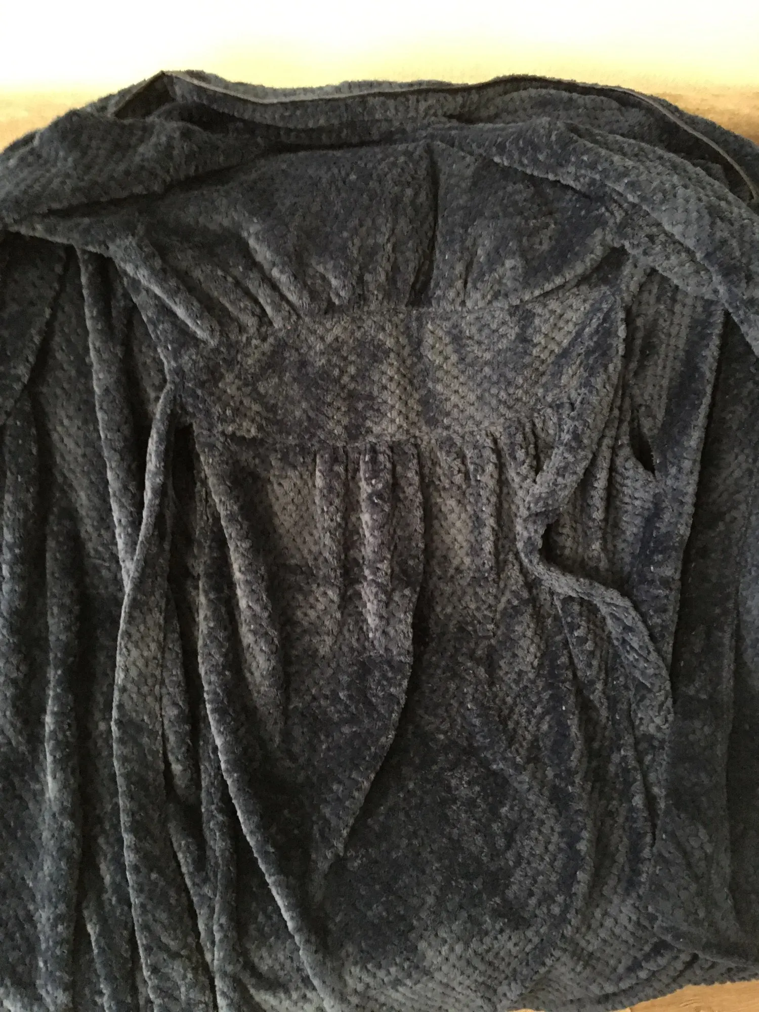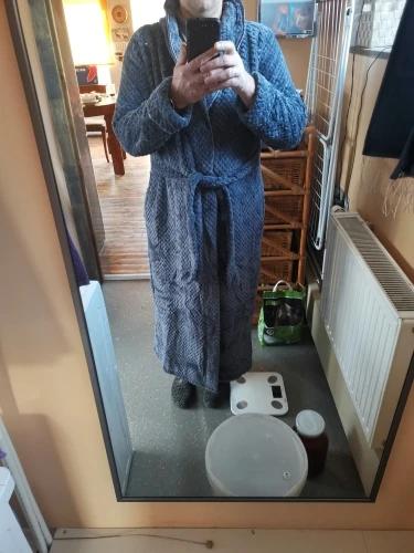 Халат прекрасный! Мягкий супертеплый! Правда, сзади он не прямой, а со складками, но для дома это не существенно. Но посылка шла почти полтора месяца, это огорчает.