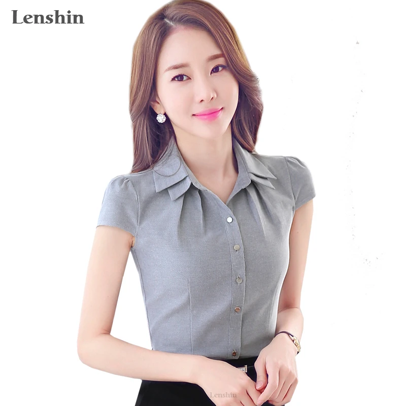 Женская хлопковая рубашка Lenshin, Повседневная стильная серая блузка с коротким рукавом, офисная одежда на лето