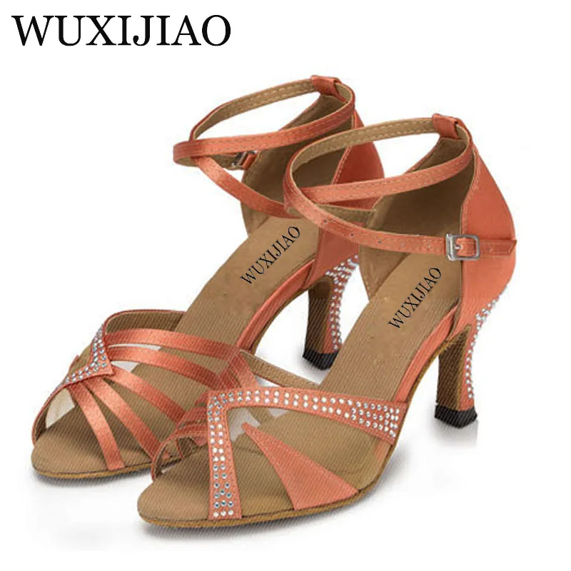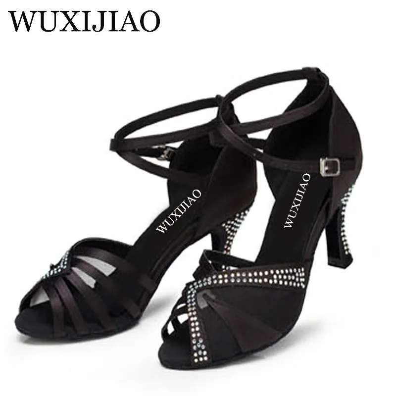 Туфли для латиноамериканских танцев WUXIJIAO, черные, оранжевые, красные, сатиновые, со стразами, стразы, для сальсы, танго, бальных танцев