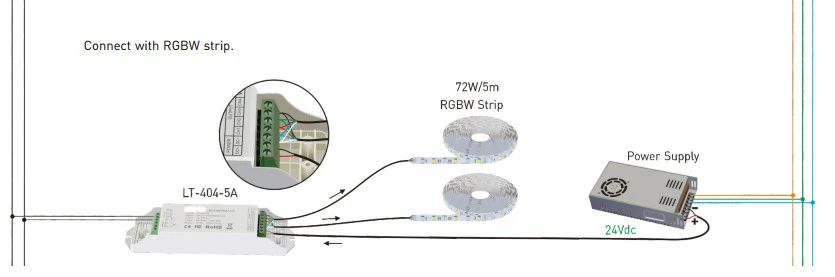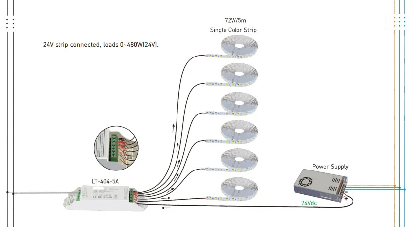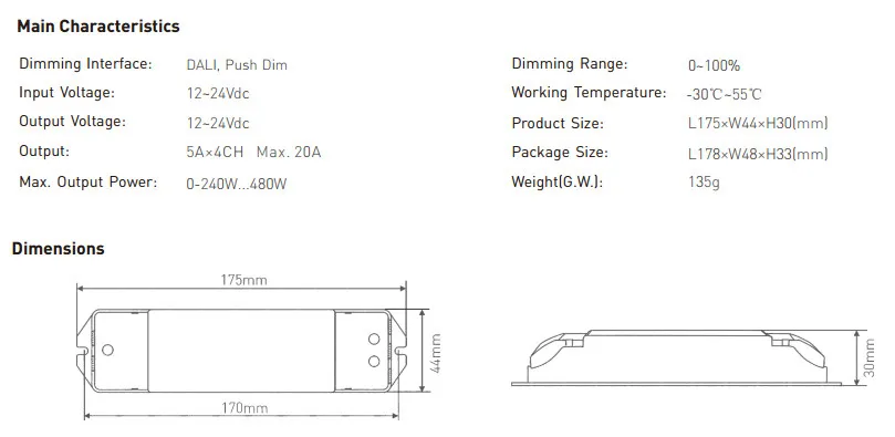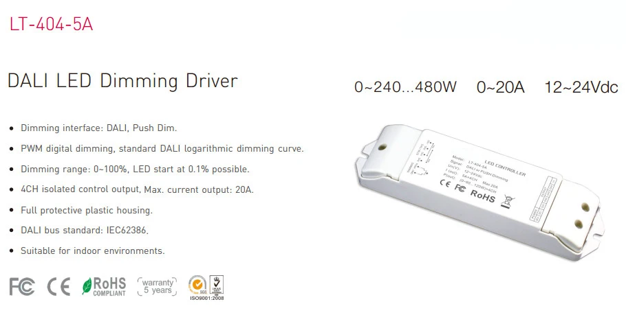 Новый LT-404-5A DALI СИД Диммируемый драйвер, DC12-24V Вход; 5A * 4CH Max 20A Выход; Пуш-ап сигнала тусклый 0-240W...480W