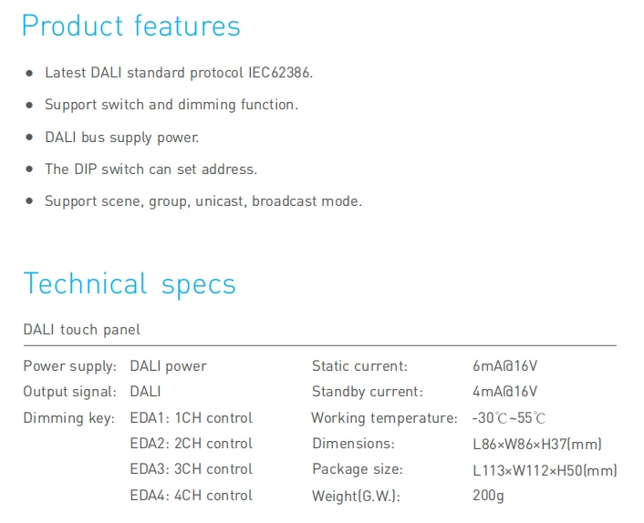 DALI-это протокол управления освещением молодого поколения в области управления освещением в настоящее время, который принимает передачу Манчестерского кодирования, в целом, группирование затемнения, решение затемнения, различные режимы сцены, отслеживание яркости, И т. д. мощная функция затемнения. Современный отель высшего класса, торговый центр, домашнее хозяйство все чаще требуют высокого стандарта для системы освещения. DALI protocol bus-мастеринг с простыми, надежными, превосходными функциями и т. д., широко используются, демонстрируя мощное преимущество в области интеллектуального управления освещением.
