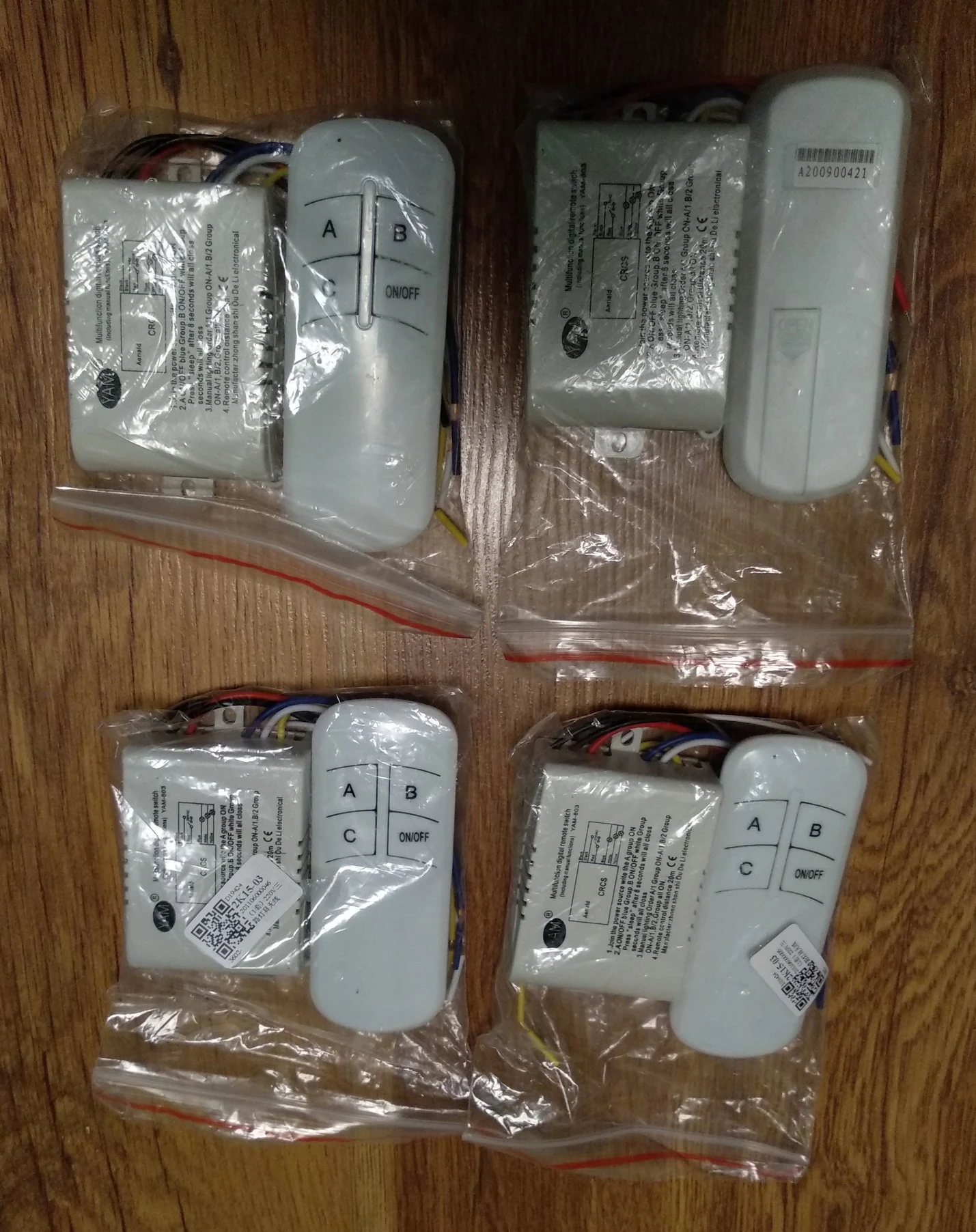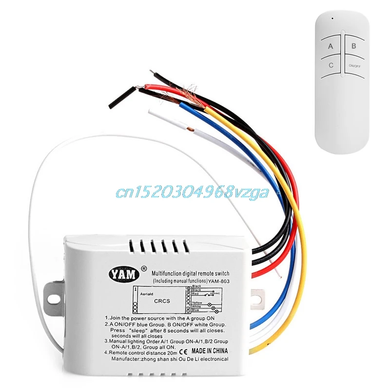 Трехходовой пульт дистанционного управления:Функция:1. A/1 будет гореть после включения.2. a/1 используется для включения/выключения синей группы, B/2 используется для включения/выключения белой группы, C/2 используется для включения/выключения желтой группы, «ВКЛ.»/«Выкл.» означает включение/выключение всего товара.3. Ручное освещение (управление настенным переключателем): A/1, B/2, C/3, вся цепь будет включена.Характеристики:1. Рабочее напряжение: AC180V-240V 50 Гц/60 Гц2. Пульт дистанционного управления: 12В 23А батарея (батарея не входит в комплект)3. Дистанция дистанционного управления: около 8-15 метров в помещении, более 20 м на открытом воздухе4. Мощность нагрузки: каждый порт нагрузка: люминесцентная лампа: 600 Вт; энергосберегающая лампа: 150 Вт; светодиод 50 Вт5. Резистивная нагрузка: самая большая выходная мощность одной группы в пределах 1000 Вт (например, лампа накаливания или лампа и т. д.)
