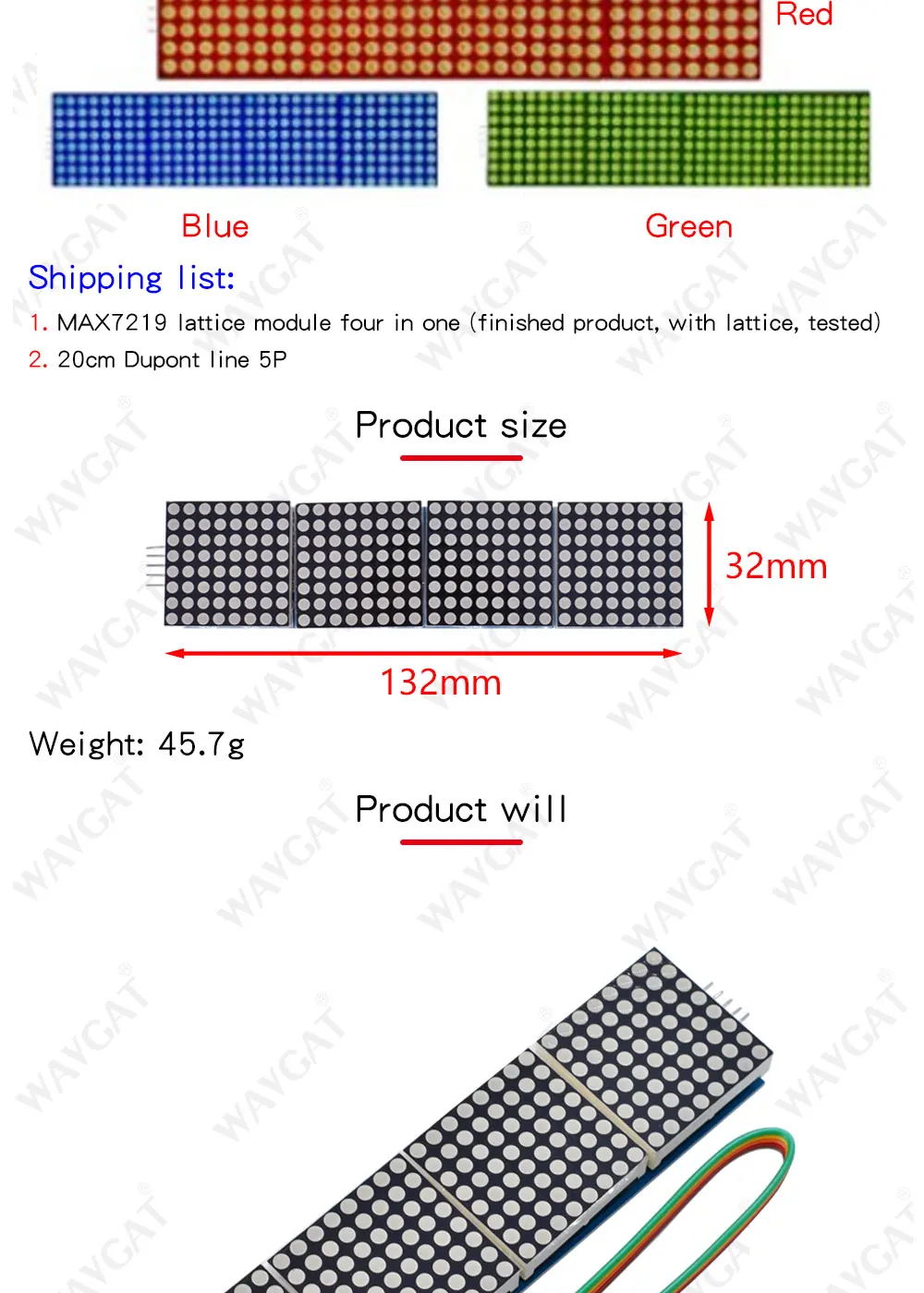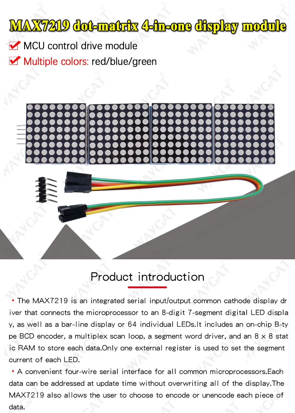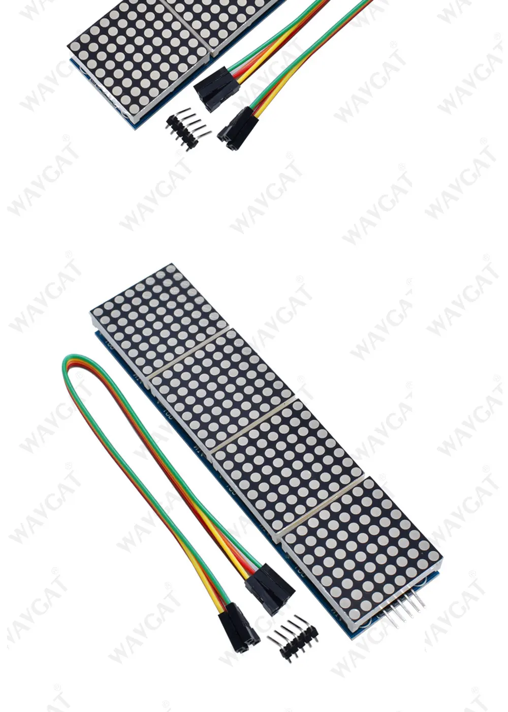 Качество пайки на высоте. Позаливал тестовые проекты, всё мигает, яркость регулируется. На м/сх маркировка спилена. В комплект 5-проводной шлейф мама-мама и "Г" образные контакты на 5 пинов, сами матрицы вставлены в цанговые зажимы.