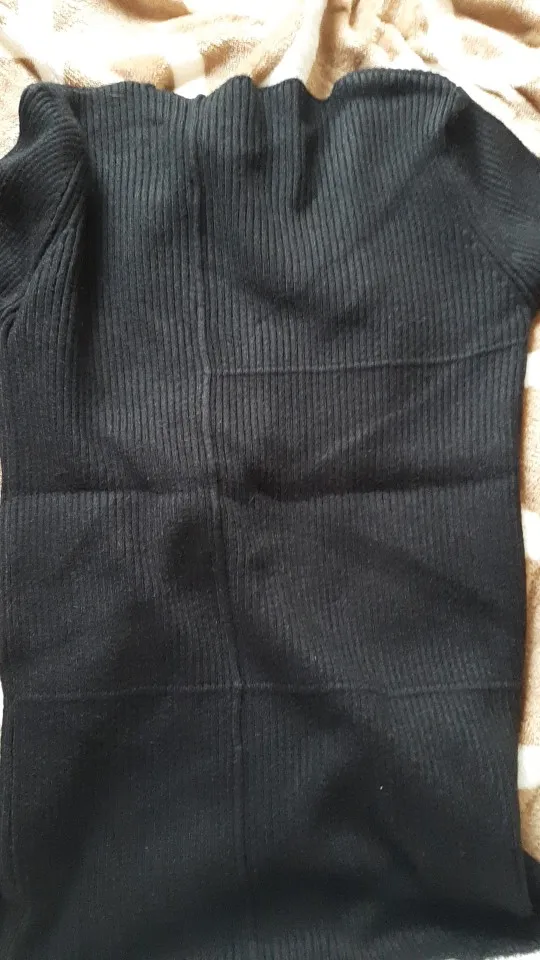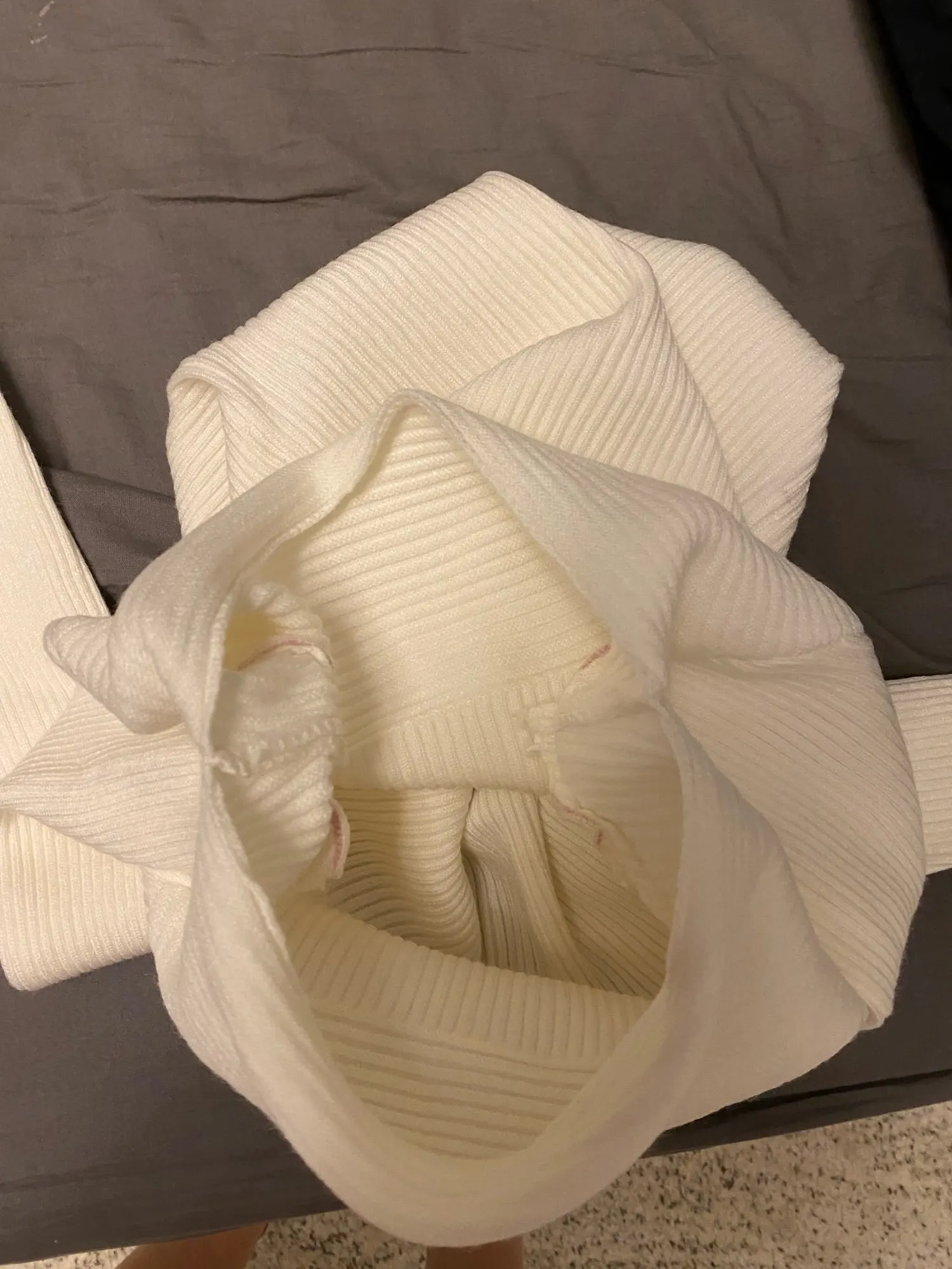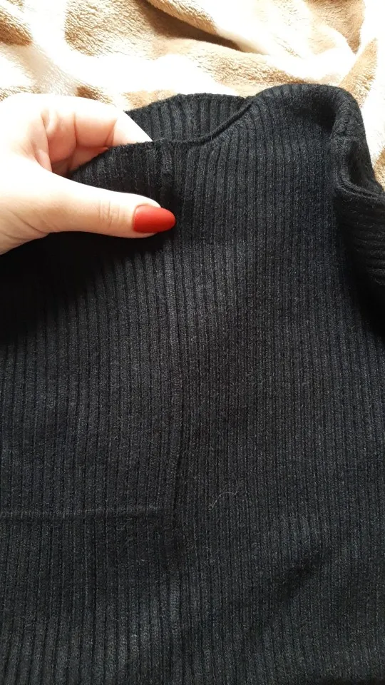 Свитер плотный, совсем не просвечивает. Для проверки надела бюстгальтер красного цвета. Плечи открытые и видно лямки. Немного не понятно где перед, а где зад кофты, они с обеих сторон совершенно одинаковые и не имеет этикеток