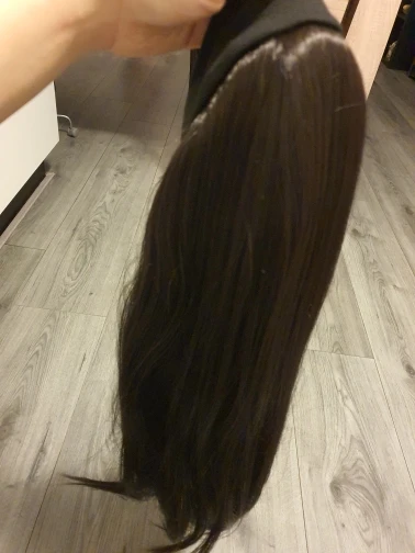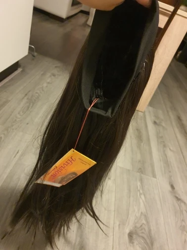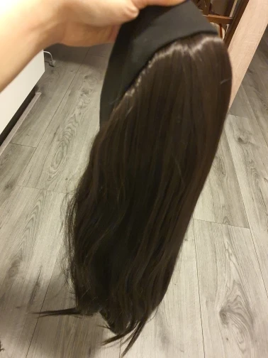 волосы густые, длинные, блестящие и гладкие. полоска плотная, размер как раз. убрала внутри железки т к они давили. парик тяжёлый. можно заплести косу, или заделать хвост. сзади волос меньше по плотности. меня все устраивает. доставка быстрая.
