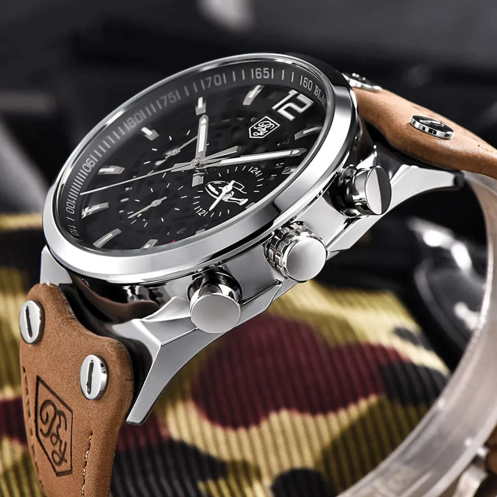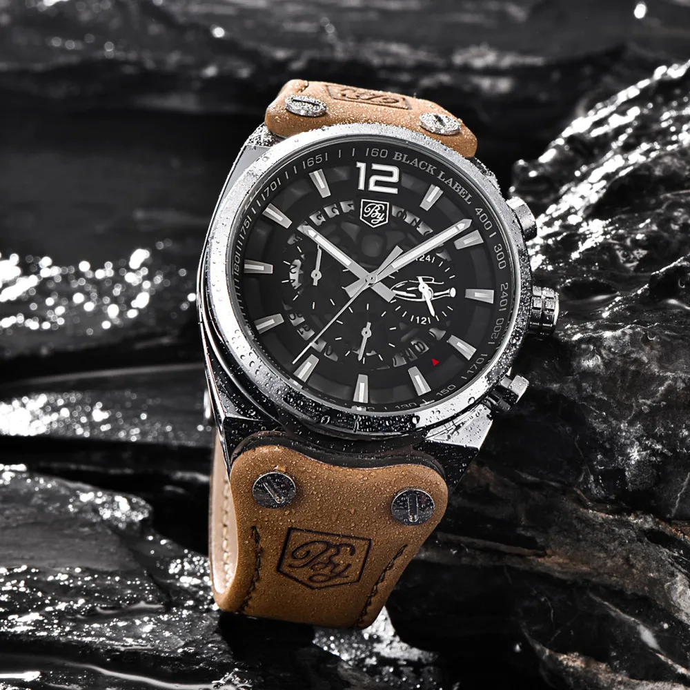 Мужские водонепроницаемые кварцевые часы-хронограф с кожаным ремешком